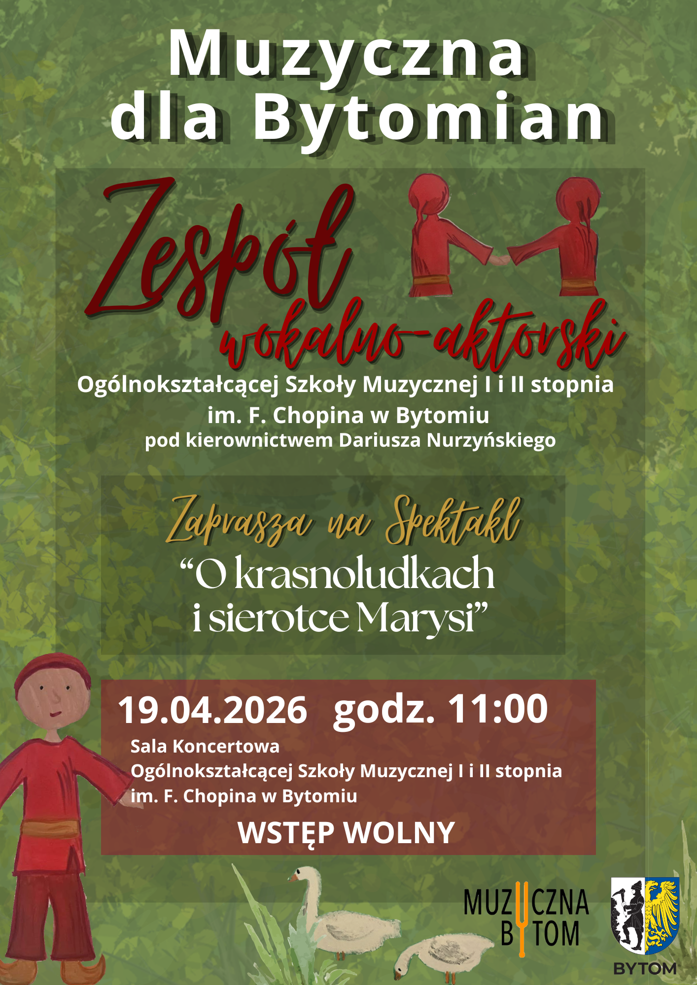 Już 19 kwietnia 2026 roku o godz. 11:00 w sali koncertowej Ogólnokształcącej Szkoły Muzycznej I i II stopnia im. F. Chopina w Bytomiu odbędzie się niezwykły spektakl pt. „O krasnoludkach i sierotce Marysi”. To propozycja skierowana do najmłodszych mieszkańców Bytomia oraz ich opiekunów – pełna magii, muzyki i teatralnych emocji.