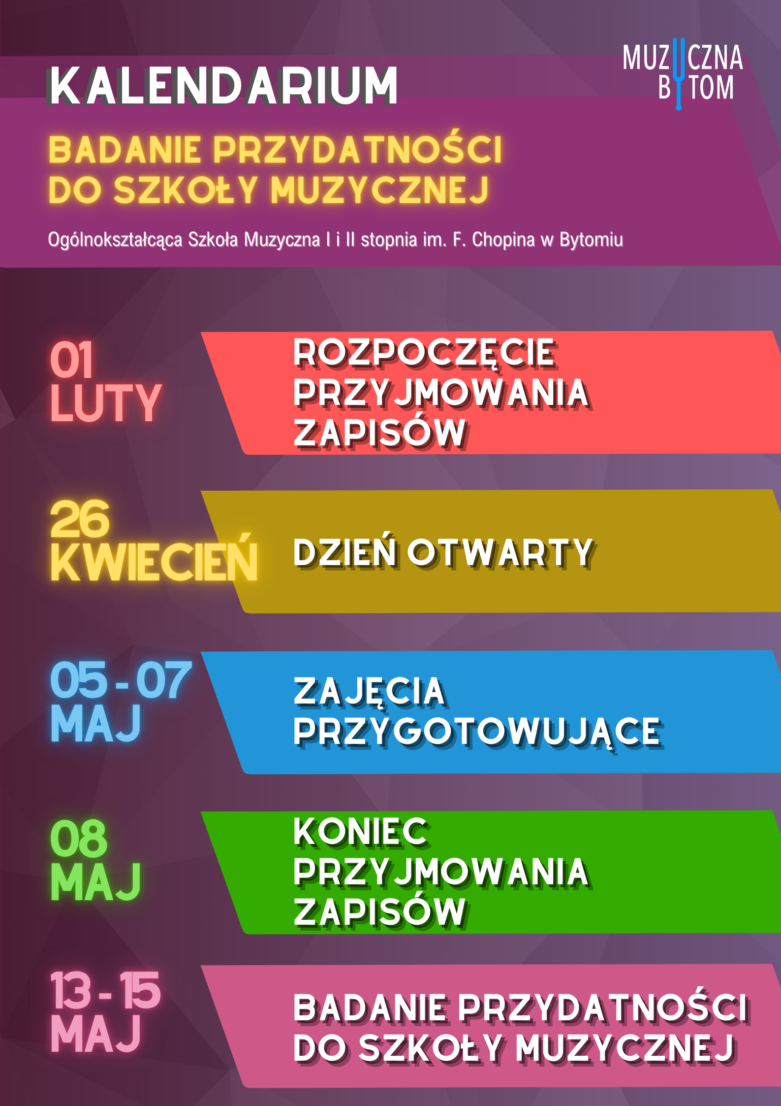 Dyrekcja Ogólnokształcącej Szkoły Muzycznej I i II stopnia im. F. Chopina w Bytomiu informuje, że z dniem 1 lutego 2025 roku rozpoczęła się rekrutacja do naszej szkoły na rok szkolny 2025/2026. Zapraszamy młodych pasjonatów muzyki do aplikowania i dołączenia do grona uczniów jednej z najbardziej prestiżowych szkół muzycznych w regionie.