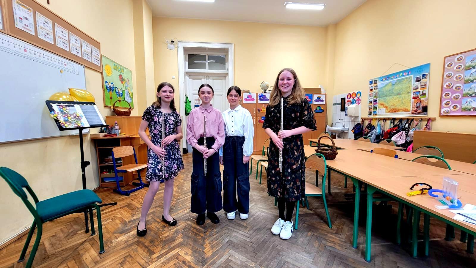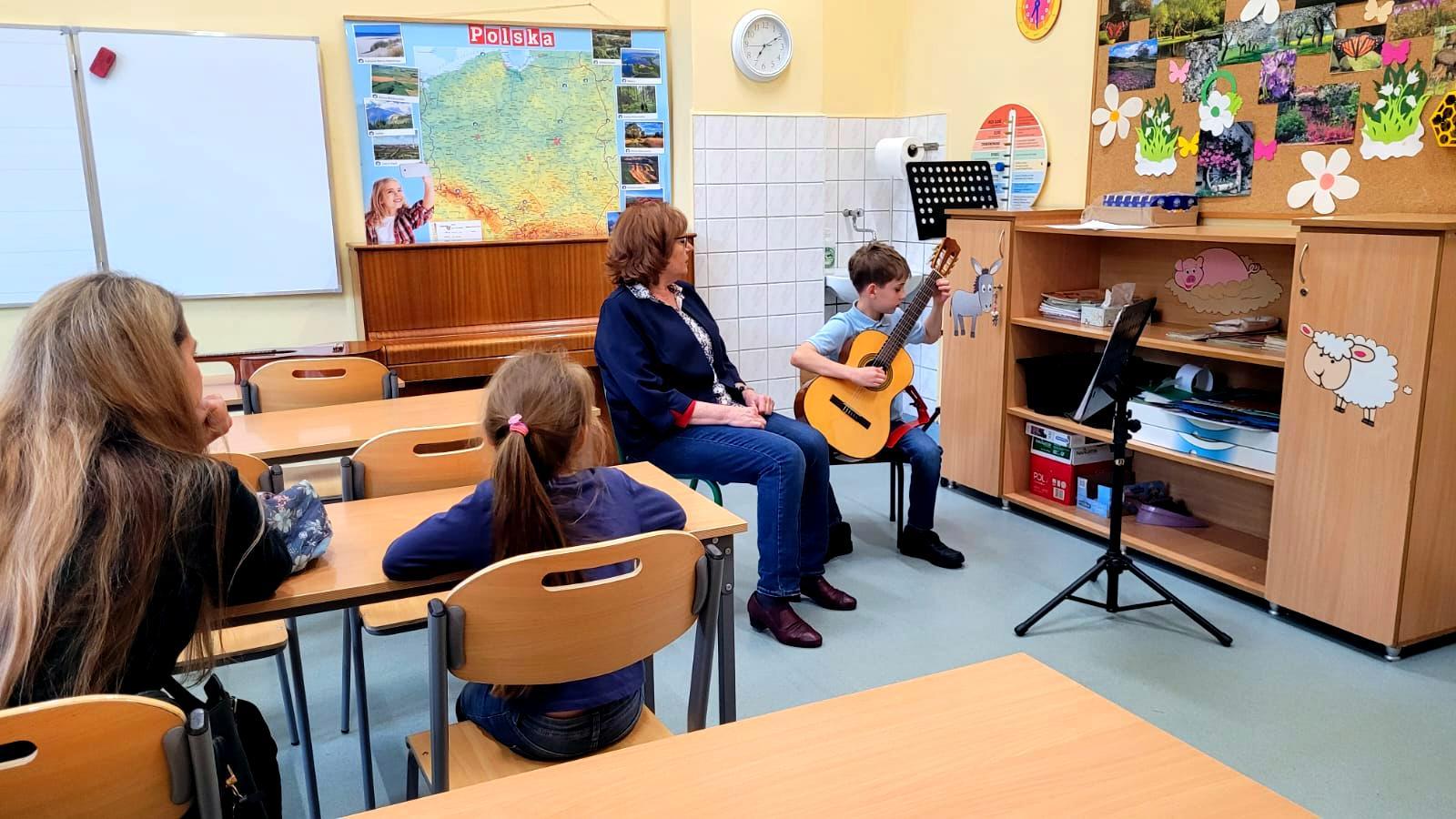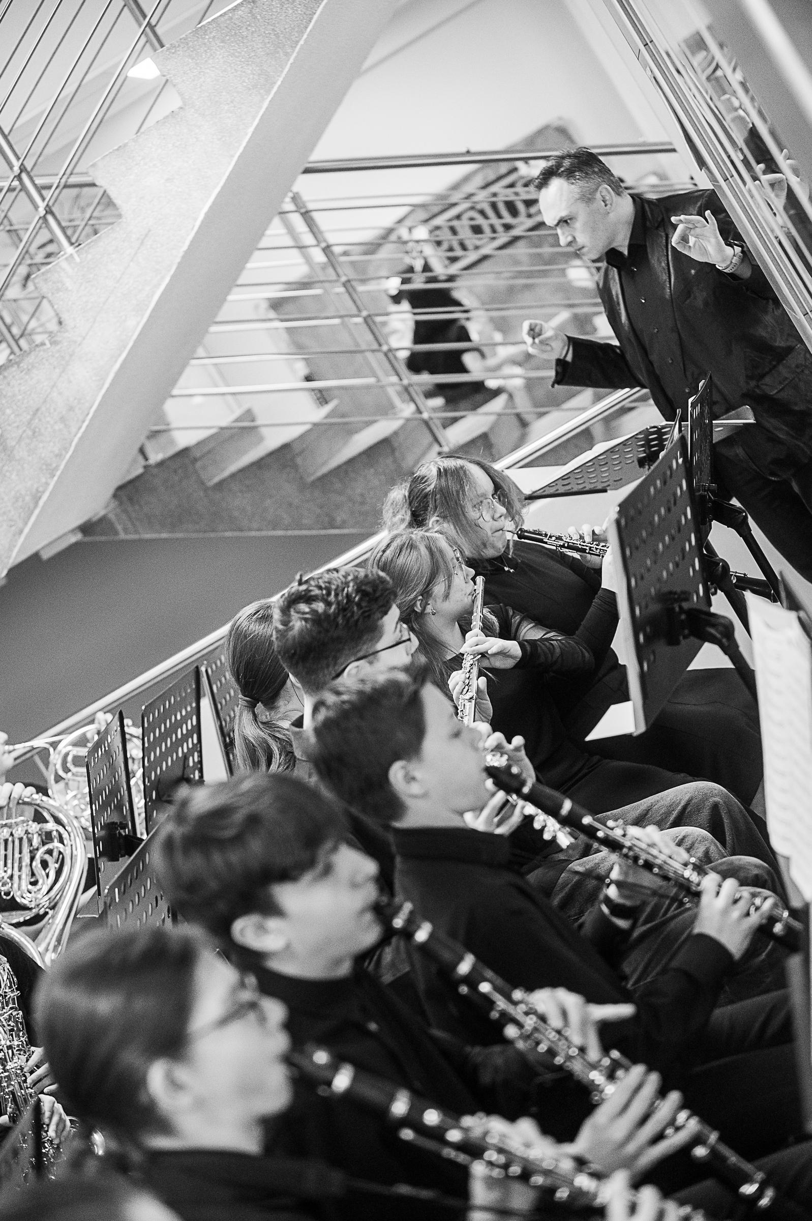 Kolejnym doniosłym wydarzeniem tego wyjątkowego dnia był koncert zespołów naszej szkoły. Wystąpiła Orkiestra Smyczkowa pod batutą p. Filipa Hugeta. Młodzi muzycy zaprezentowali utwory muzyki filmowej i klasycznej. Następnie zaprezentowały się zespoły instrumentów dętych, kierowane przez p. Karola Goryla i p. Tomasza Wójtowicza. Na scenie wybrzmiały utwory znane i powszechnie lubiane. Największe zainteresowanie wzbudził tercet solistów, prowadzony przez nauczycielki śpiewu – p. Aleksandrę Poniszowską i Agnieszkę Osiecką-Bochenek. Chłopcy brawurowo odśpiewali arie. Na zakończenie koncertu w pięknej sali koncertowej wystąpił chór dziecięcy, kierowany przez p. Agnieszkę Piasecką-Orlow. Uczniowie zaśpiewali różnorodne pieśni, ale największymi brawami nagrodzono utwór pt. Mucha. Piosenkę tę napisała p. Anna Siemińska, a chór wykonał ją brawurowo przy akompaniamencie autorki.