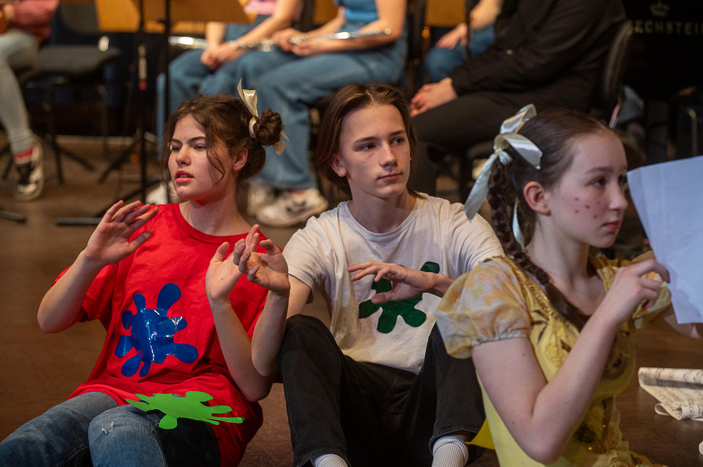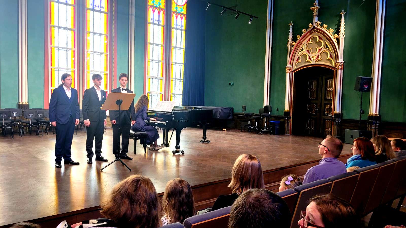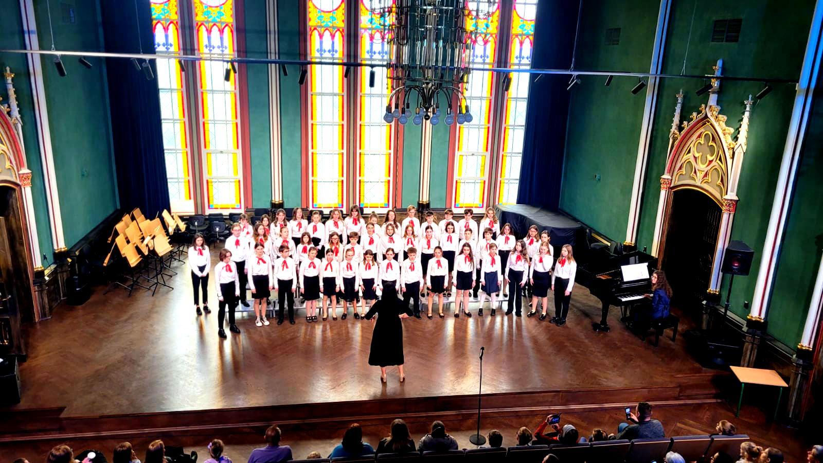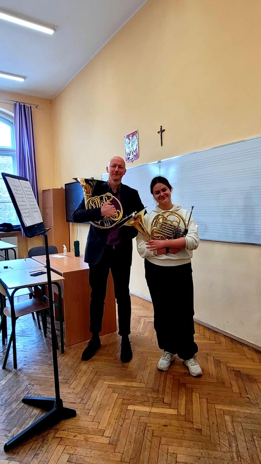 Kolejnym doniosłym wydarzeniem tego wyjątkowego dnia był koncert zespołów naszej szkoły. Wystąpiła Orkiestra Smyczkowa pod batutą p. Filipa Hugeta. Młodzi muzycy zaprezentowali utwory muzyki filmowej i klasycznej. Następnie zaprezentowały się zespoły instrumentów dętych, kierowane przez p. Karola Goryla i p. Tomasza Wójtowicza. Na scenie wybrzmiały utwory znane i powszechnie lubiane. Największe zainteresowanie wzbudził tercet solistów, prowadzony przez nauczycielki śpiewu – p. Aleksandrę Poniszowską i Agnieszkę Osiecką-Bochenek. Chłopcy brawurowo odśpiewali arie. Na zakończenie koncertu w pięknej sali koncertowej wystąpił chór dziecięcy, kierowany przez p. Agnieszkę Piasecką-Orlow. Uczniowie zaśpiewali różnorodne pieśni, ale największymi brawami nagrodzono utwór pt. Mucha. Piosenkę tę napisała p. Anna Siemińska, a chór wykonał ją brawurowo przy akompaniamencie autorki.