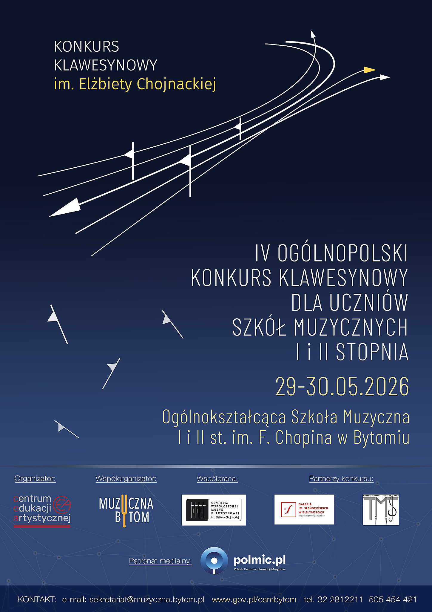 Serdecznie zapraszamy do udziału w IV Ogólnopolskim Konkursie Klawesynowym im. Elżbiety Chojnackiej, który odbędzie się w dniach 29-30 maja 2026 roku w murach Ogólnokształcąca Szkoła Muzyczna I i II stopnia im. F. Chopina w Bytomiu.