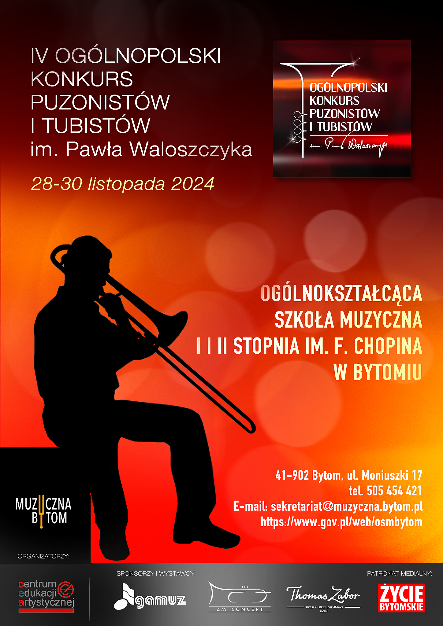 Serdecznie zapraszamy do udziału w IV Ogólnopolskim Konkursie Puzonistów i Tubistów im. Pawła Waloszczyka, który odbędzie się w dniach od 28 do 30 listopada 2024 roku w Bytomiu.