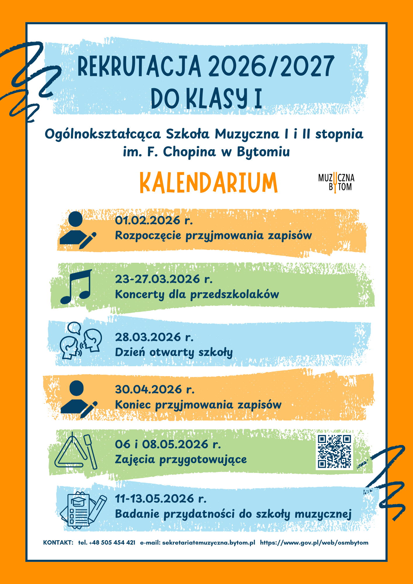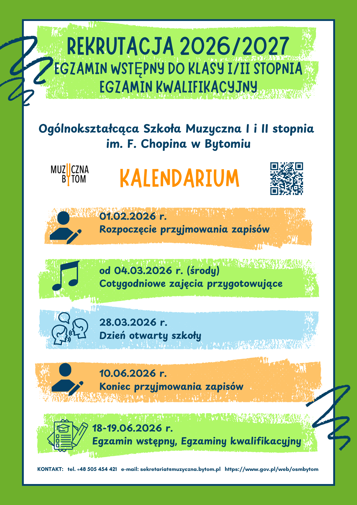 Informujemy, że rozpoczęliśmy zapisy na rok szkolny 2026/2027 do Ogólnokształcącej Szkoły Muzycznej I i II stopnia im. F. Chopina w Bytomiu. To doskonała okazja, aby dziecko mogło rozwijać swoje muzyczne pasje i talenty w inspirującym środowisku, pod opieką doświadczonej i wykwalifikowanej kadry pedagogicznej.