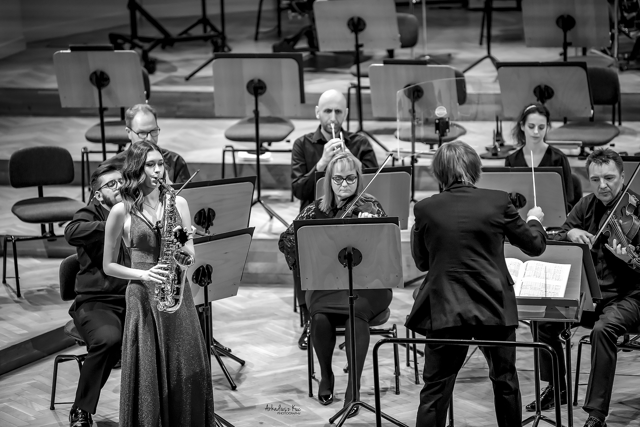 Następnie salę koncertową wypełniły dźwięki Sonaty saksofonowej nawiązującej do muzyki rozrywkowej początku XX wieku. Alina Kaczkowska z klasy saksofonu pana Krystiana Lipińskiego brawurowo przedstawiła swój instrument, ukazując jego możliwości techniczne i brzmieniowe. Prezentacja wymagała ścisłej współpracy z zespołem towarzyszącym, w którym muzycy realizowali partie solowe.