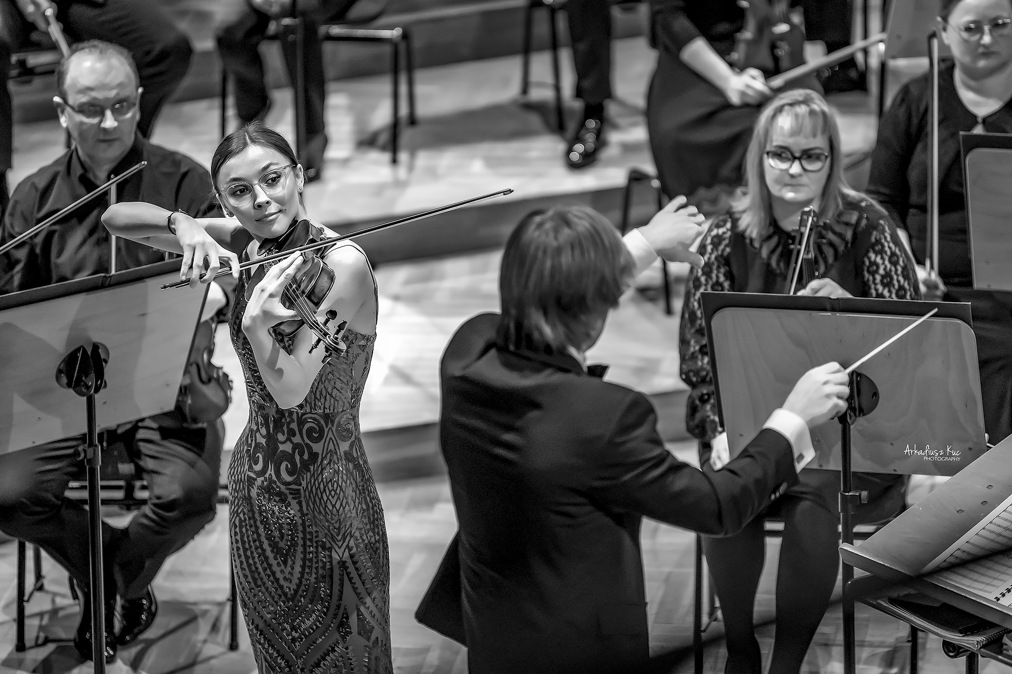 Dyplomantka z klasy skrzypiec pana Jacka Siemka Emilia Widera zaprezentowała Introdukcję i Rondo Capriccioso – niezwykle trudny utwór, którego kompozytorem jest Camille Saint-Saëns. Solistka wykazała się dużym opanowaniem scenicznym oraz wysoką umiejętnością współpracy z dyrygentem i zespołem orkiestrowym.