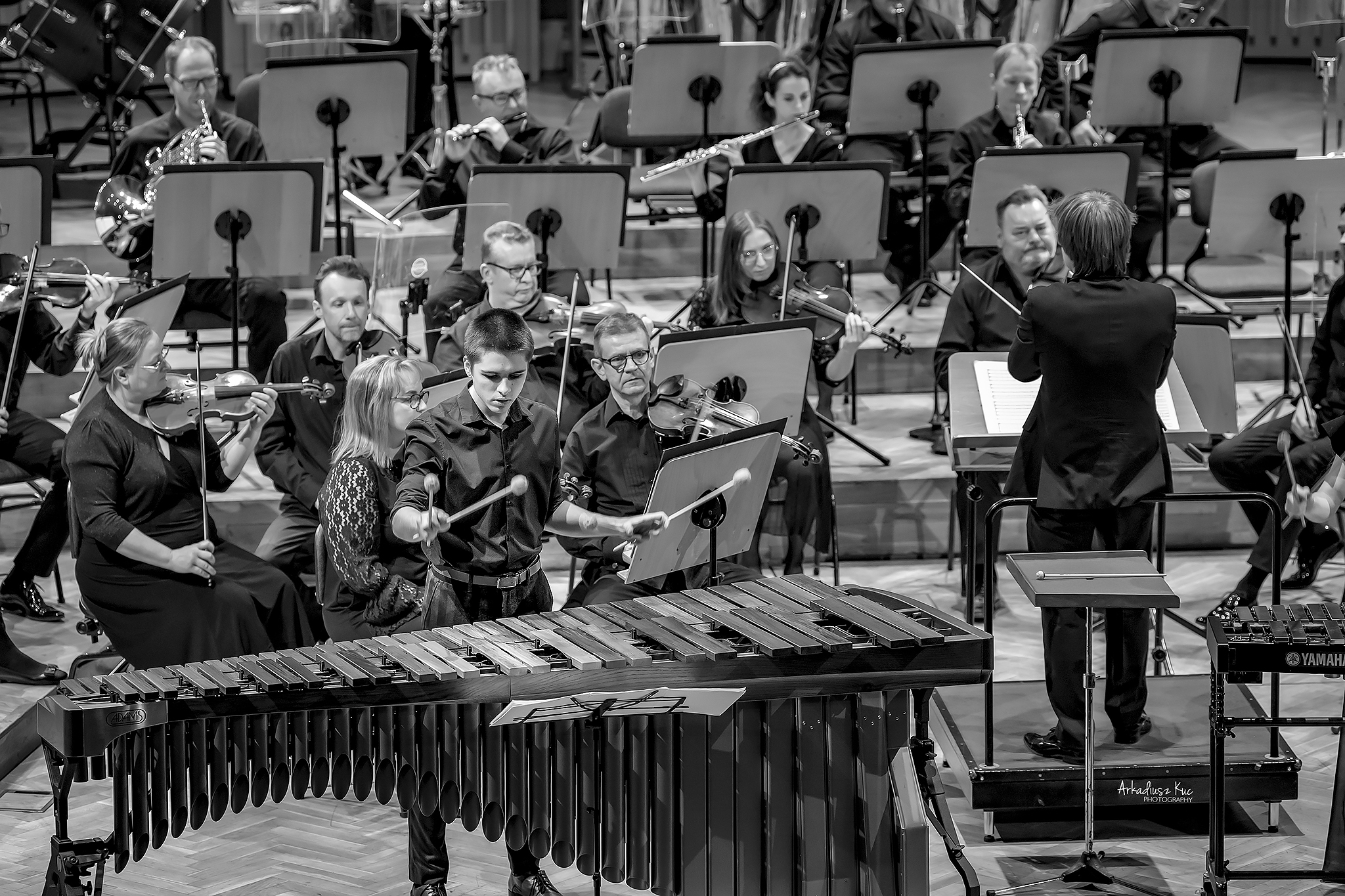 Koncert rozpoczął duet perkusyjny w składzie Nadia Mikołajczyk i Bartłomiej Koźniewski. Młodzi perkusiści pracujący pod kierunkiem pana Adama Bonka i pana Wojciecha Herzyka ukazali możliwości melodyczne instrumentów perkusyjnych, zachwycili również energią i bezbłędną synchronizacją występu.