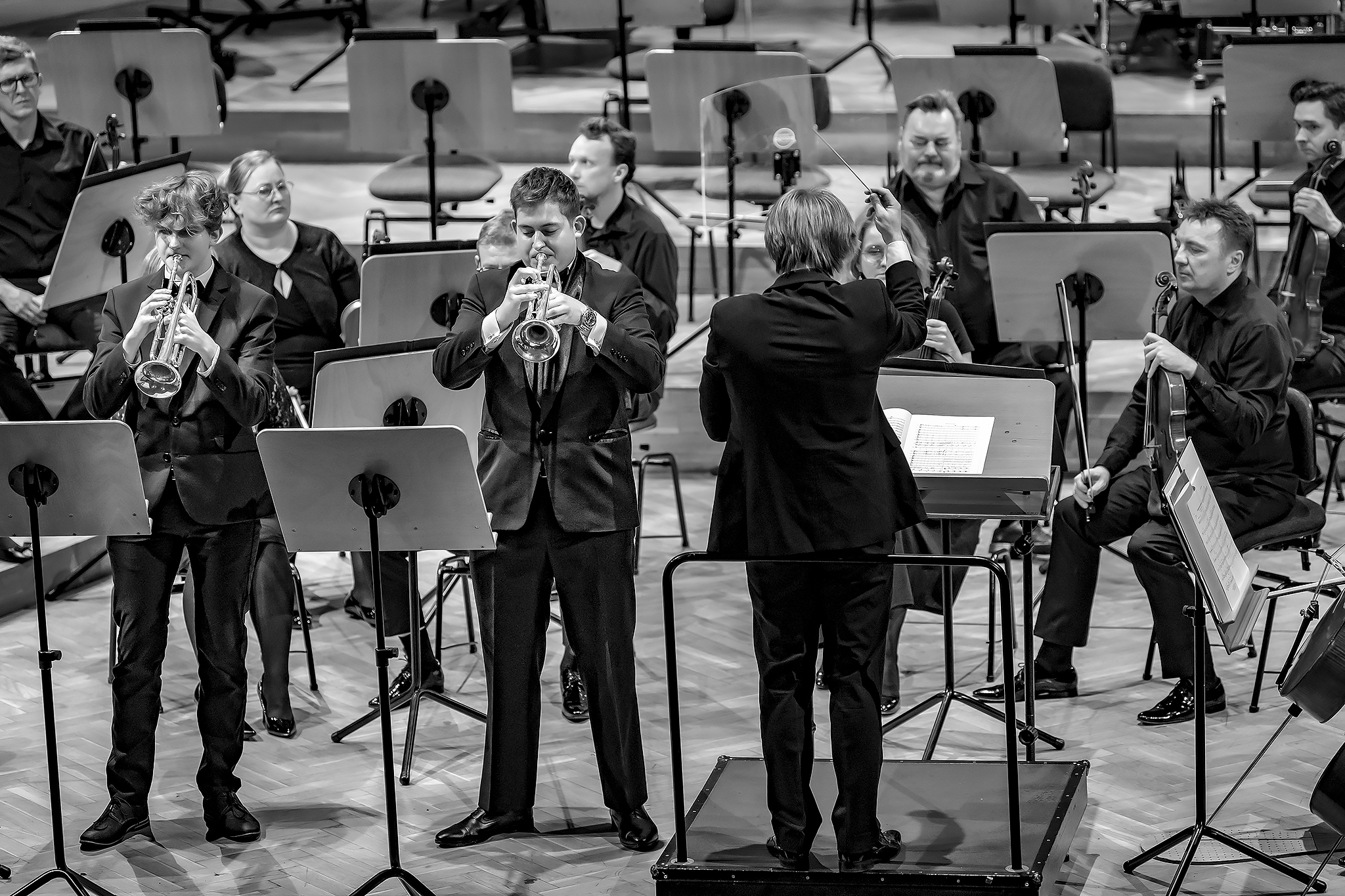 Klamrą koncertu był występ duetu trębaczy w składzie Dawid Zieleniucha i Marcin Kaintoch. Młodzi muzycy – wychowankowie panów Artura Kulki i Arkadiusza Garusa – udowodnili, że trąbka jest zarówno instrumentem lirycznym jak i popisowym. W wolnej części zgodnie prowadzili dialog z harfą, by w części szybkiej zachwycić słuchaczy wielką sprawnością techniczną i ścisłym współgraniem w kadencji.