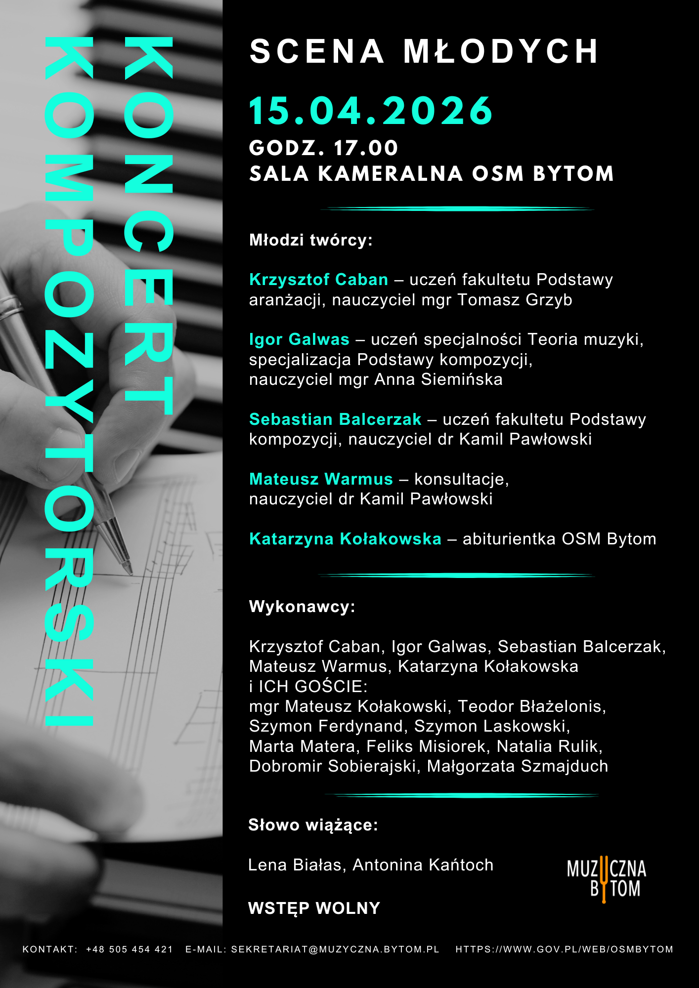 Serdecznie zapraszamy na wyjątkowy Koncert Kompozytorski „Scena Młodych”, który odbędzie się 15 kwietnia 2026 roku o godzinie 17:00 w sali kameralnej Ogólnokształcącej Szkoły Muzycznej I i II stopnia im. F. Chopina w Bytomiu.