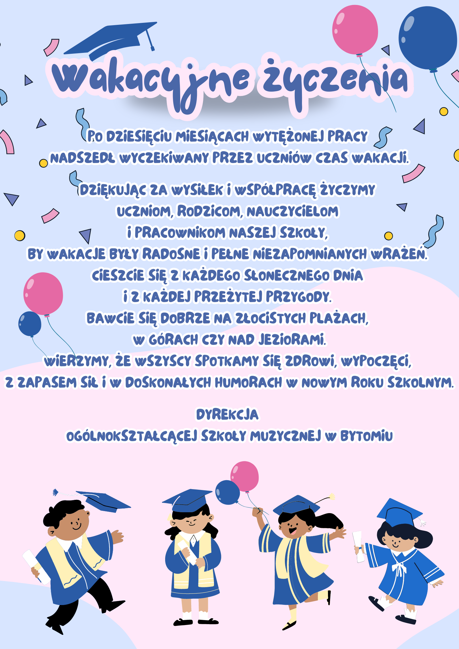 Na niebieskim tle hasło "wakacyjne życzenia", konfetti, balony, biret