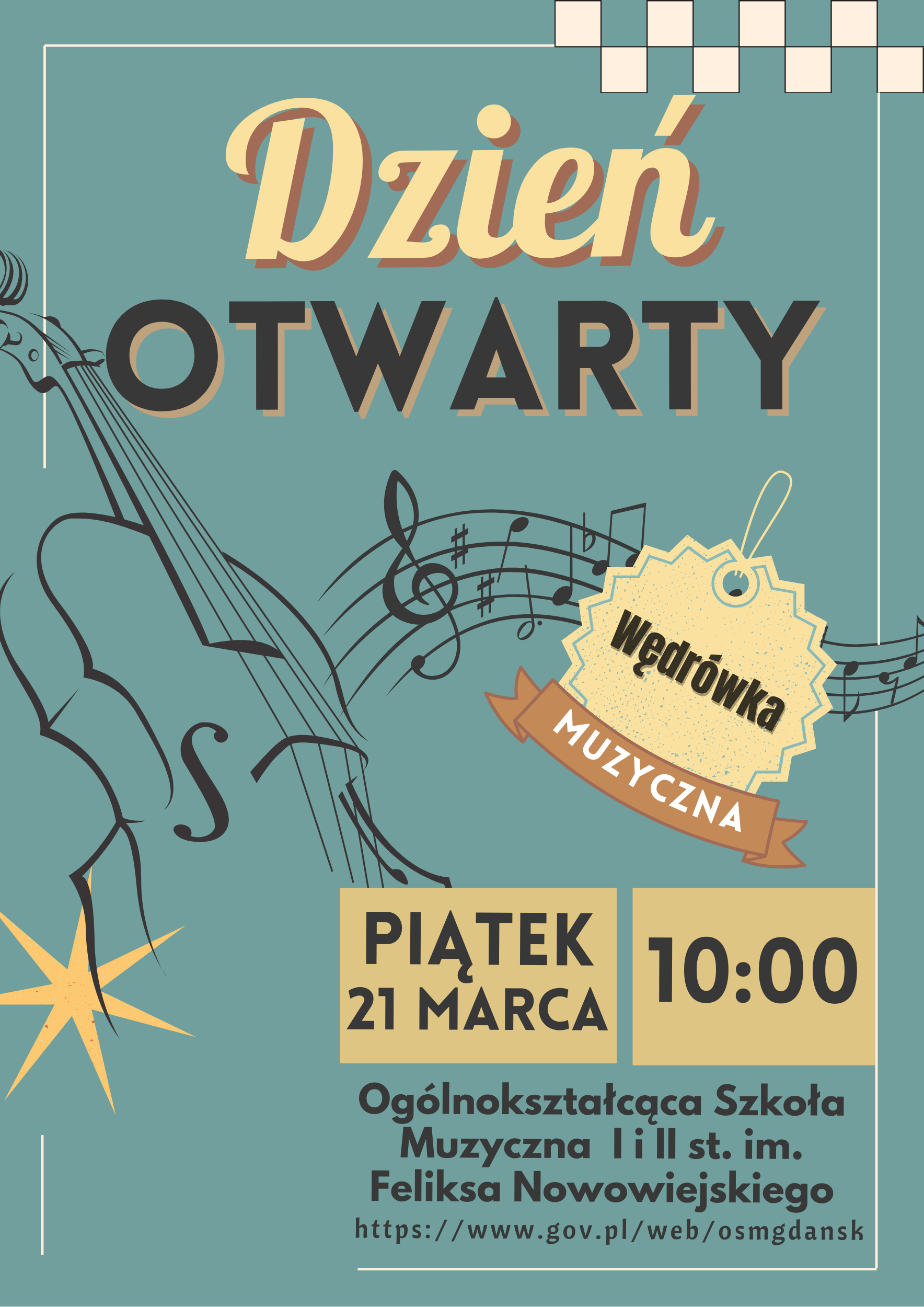 21 marca 2025 r. w godzinach od 10.00 do 15.00 serdecznie zapraszamy na Dzień Otwarty Szkoły. W programie między innymi konsultacje, lekcje otwarte, koncerty, symulacje egzaminów wstępnych i badania przydatności.