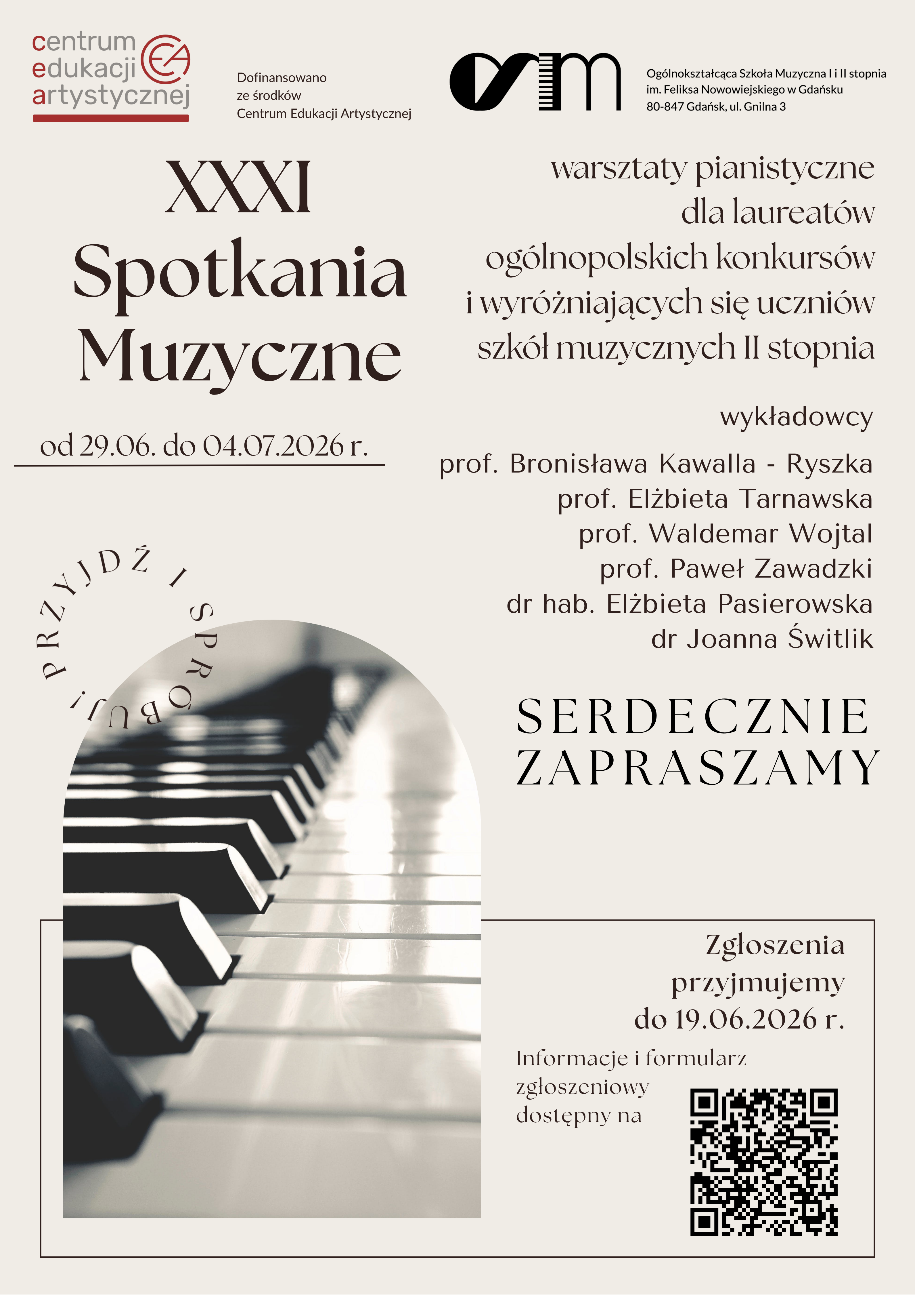 Serdecznie zapraszamy do wzięcia udziału w XXXI Spotkaniach Muzycznych , Warsztatach Pianistycznych dla laureatów ogólnopolskich konkursów i wyróżniających się uczniów szkół muzycznych II stopnia organizowanych w dniach 29.06 - 04.07. 2026 r. w naszej szkole.