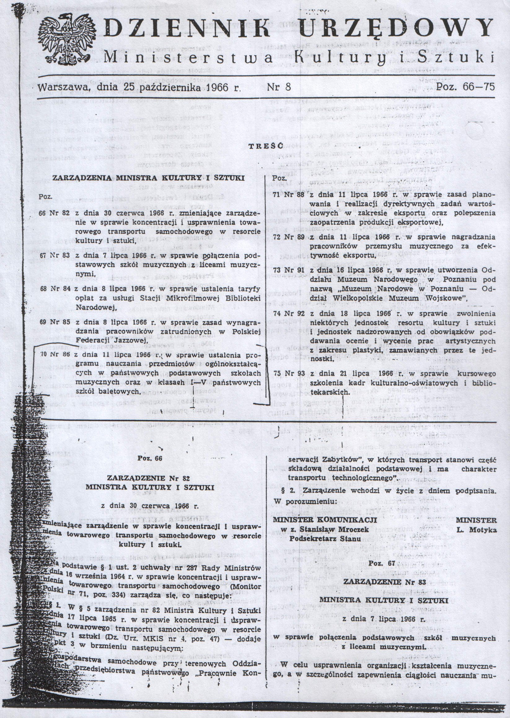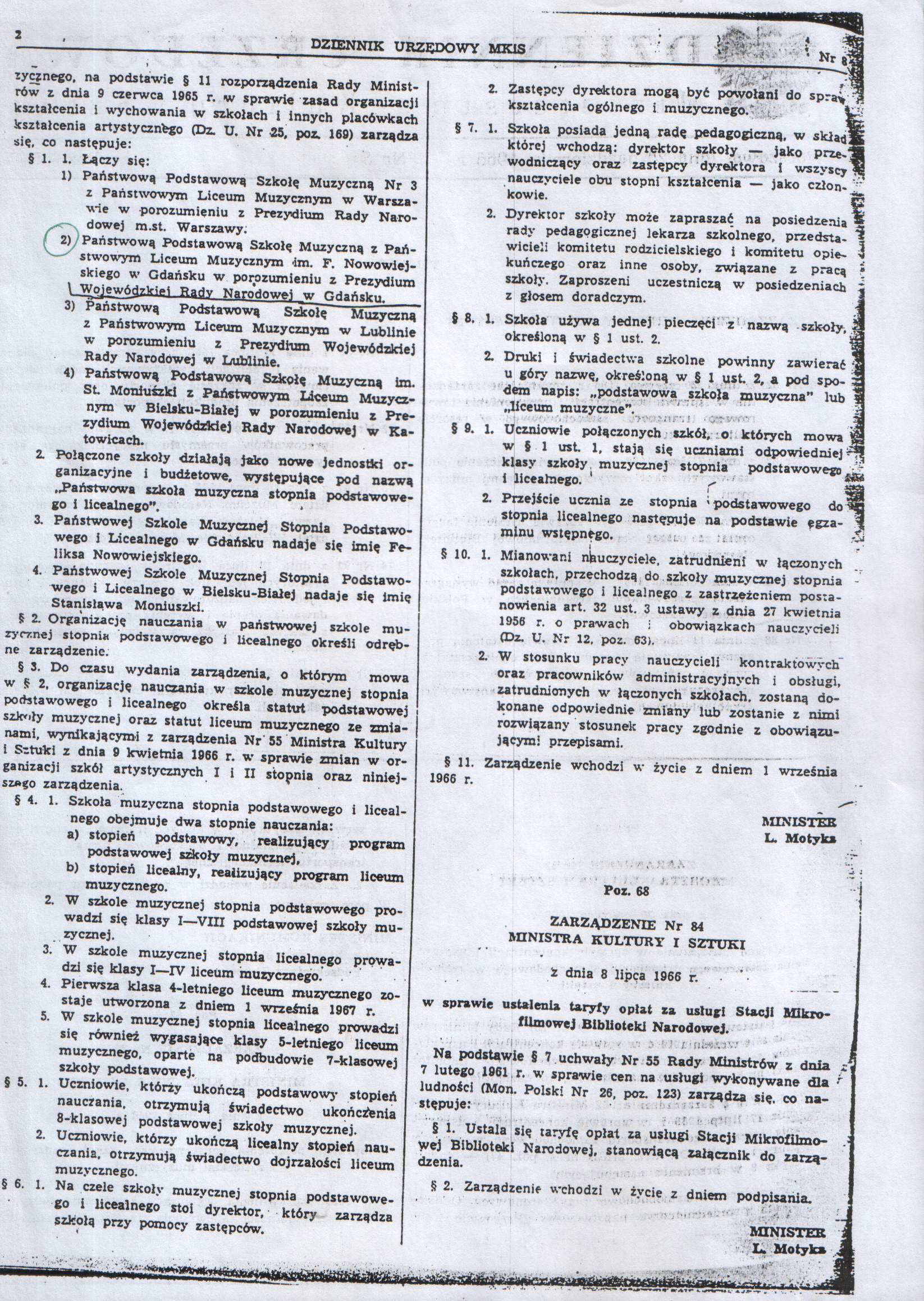 Zarządzenie nr 83 Ministra Kultury i Sztuki z dnia 7 lipca 1966 r. w sprawie połącznienia podstawowych szkół muzycznych z liceami muzycznymi:
