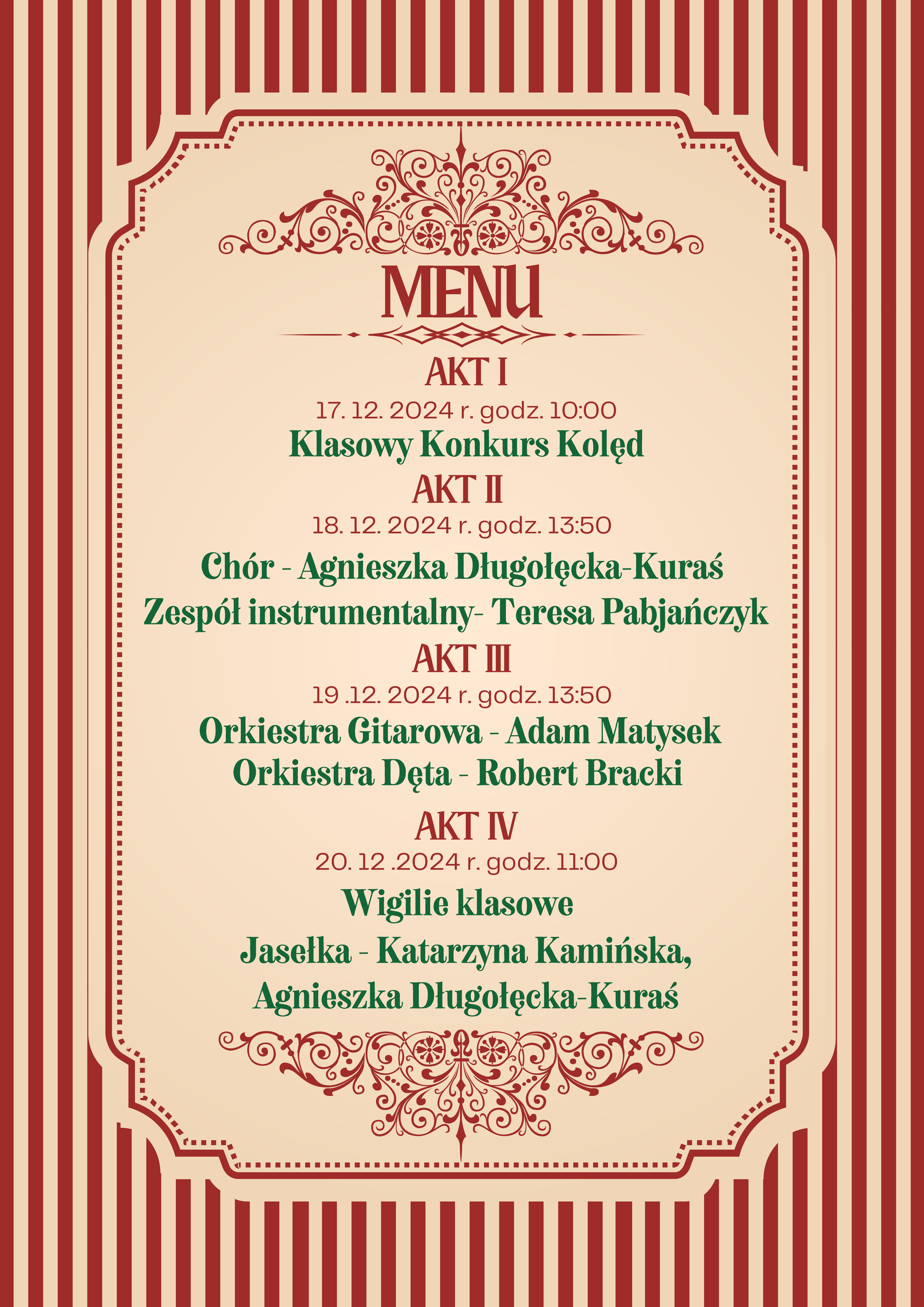 W okresie przedświątecznym przygotowaliśmy dla Was bogaty program wydarzeń artystycznych. Nasza „Opera choinkowa” pod wspólną nazwą „Świąteczne przysmaki” zaprezentuje wyjątkowo atrakcyjne menu. Będziemy świadkami klasowego konkursu kolęd, podczas którego nagrodzimy najpiękniejsze wykonania, chór szkolny zaprezentuje kolędy i pastorałki, które rozgrzeją Wasze serca, zespół instrumentalny zabierze nas w muzyczną podróż po świecie fantastycznych melodii, brzmienie wielu gitar stworzy niepowtarzalną atmosferę świątecznych wieczorów, a mocne dźwięki orkiestry dętej wypełnią salę koncertową świąteczną radością. Zwieńczeniem tego fantastycznego tygodnia będą wyjątkowe wigilie klasowe, a uczniowie zaprezentują wzruszające jasełka, które przypomną nam o prawdziwym znaczeniu świąt. Całość wprowadzi nas wszystkich w magiczną atmosferę Bożego Narodzenia.