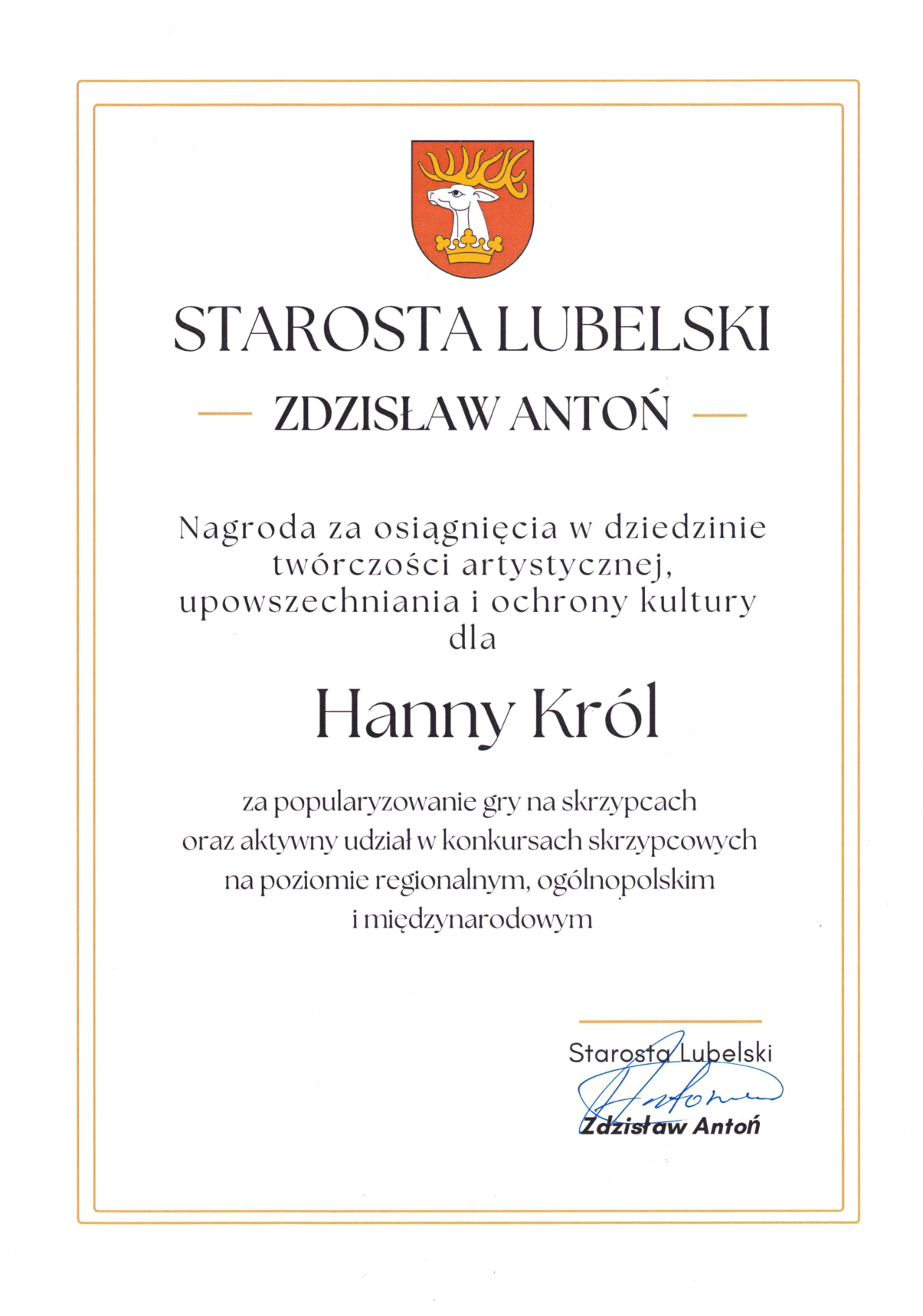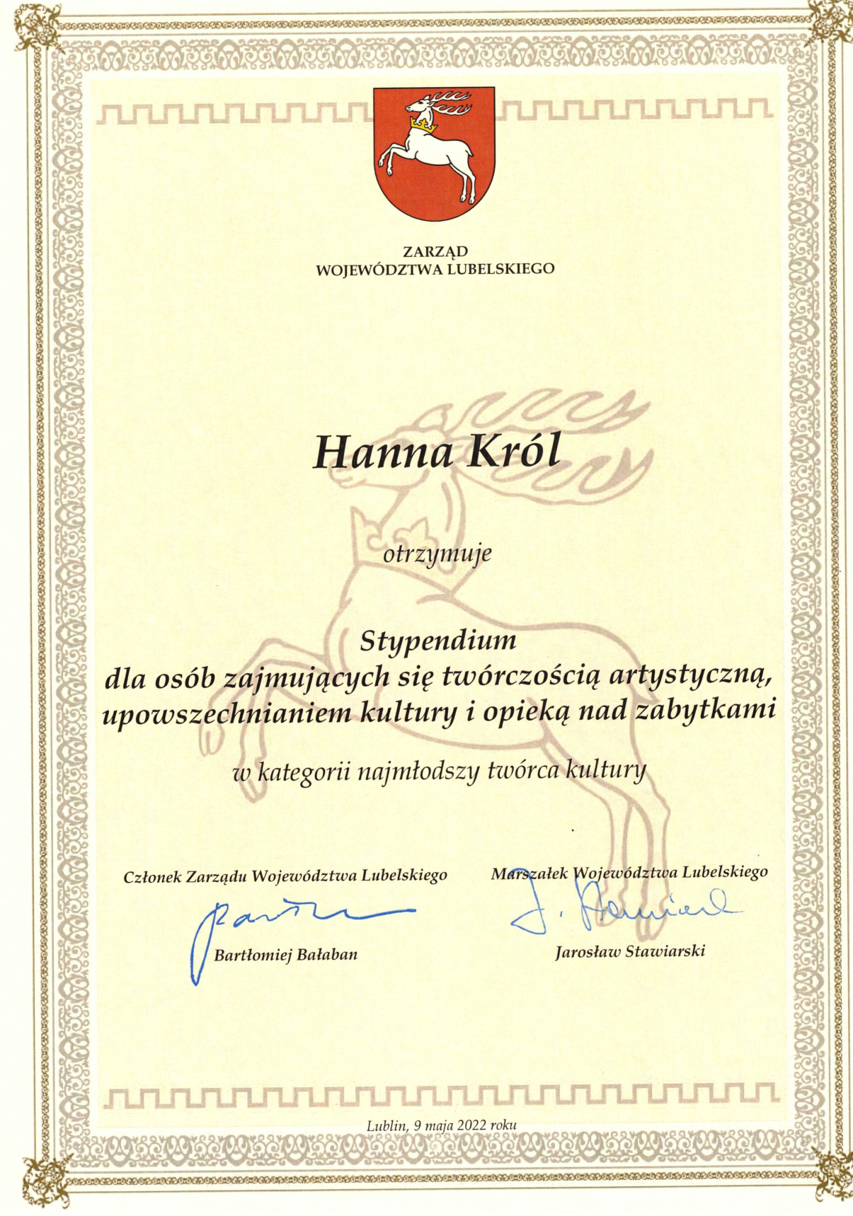Hanna Król, otrzymała Stypendium Marszałka Województwa Lubelskiego za osiągnięcia artystyczne w kategorii najmłodszy twórca kultury oraz Nagrodę Starosty Lubelskiego za osiągnięcia w dziedzinie twórczości artystycznej, upowszechniania i ochrony kultury.