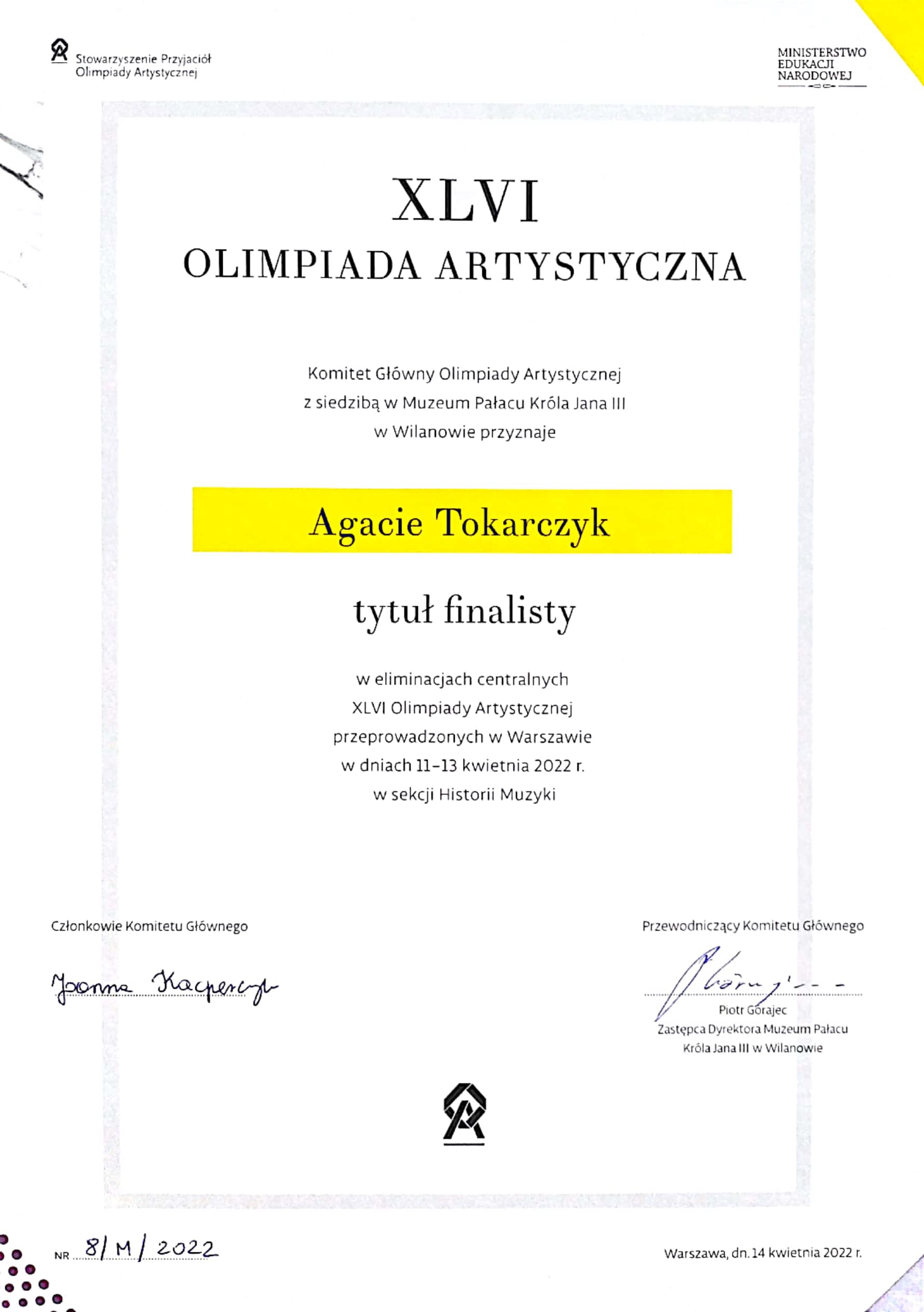Agata Tokarczyk z klasy VI OSM II stopnia zdobyła tytuł Finalistki 46 Ogólnopolskiej Olimpiady Artystycznej w sekcji Historii muzyki.