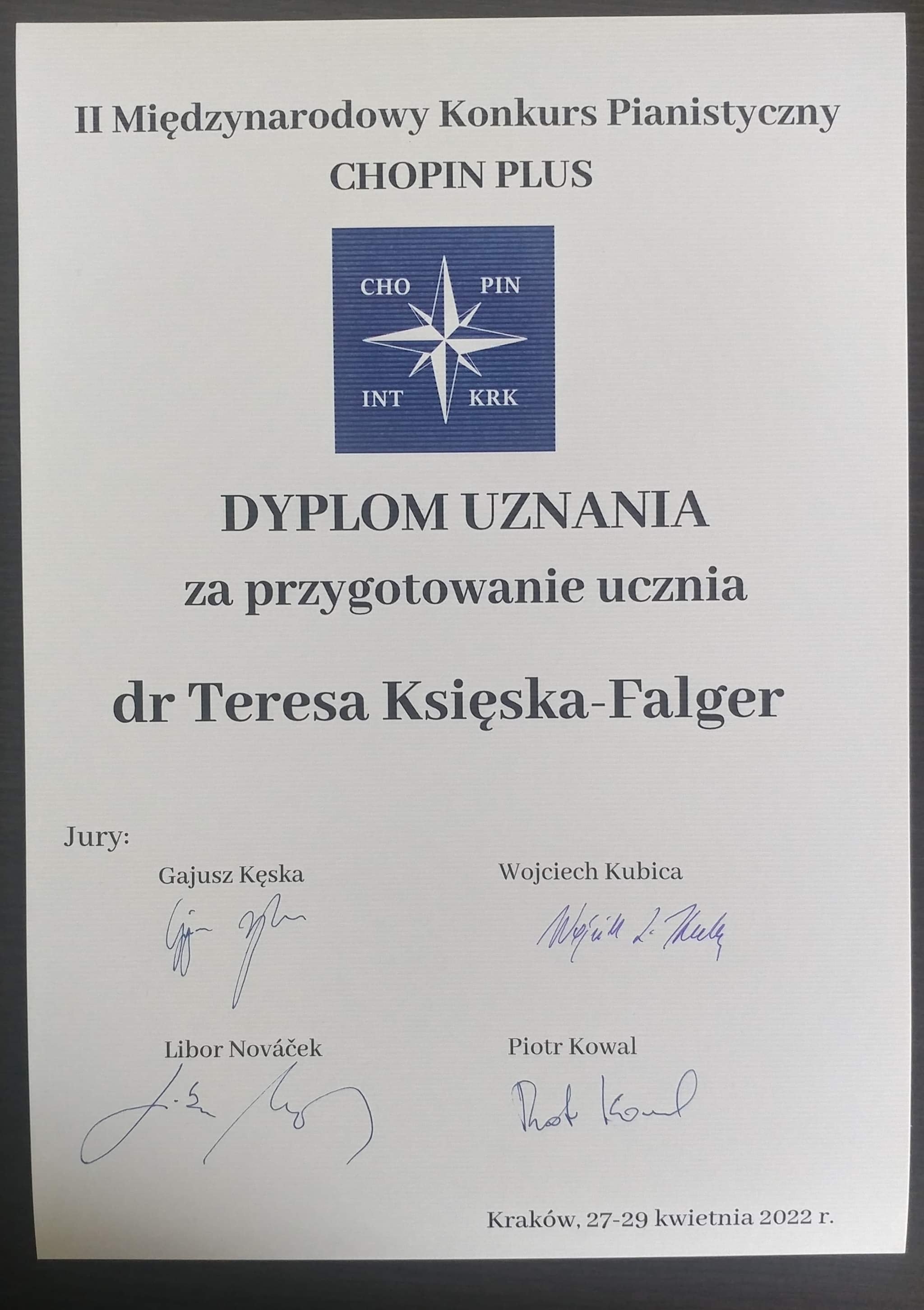 Pani Teresa Księska-Falger otrzymała DYPLOM UZNANIA za przygotowanie ucznia.