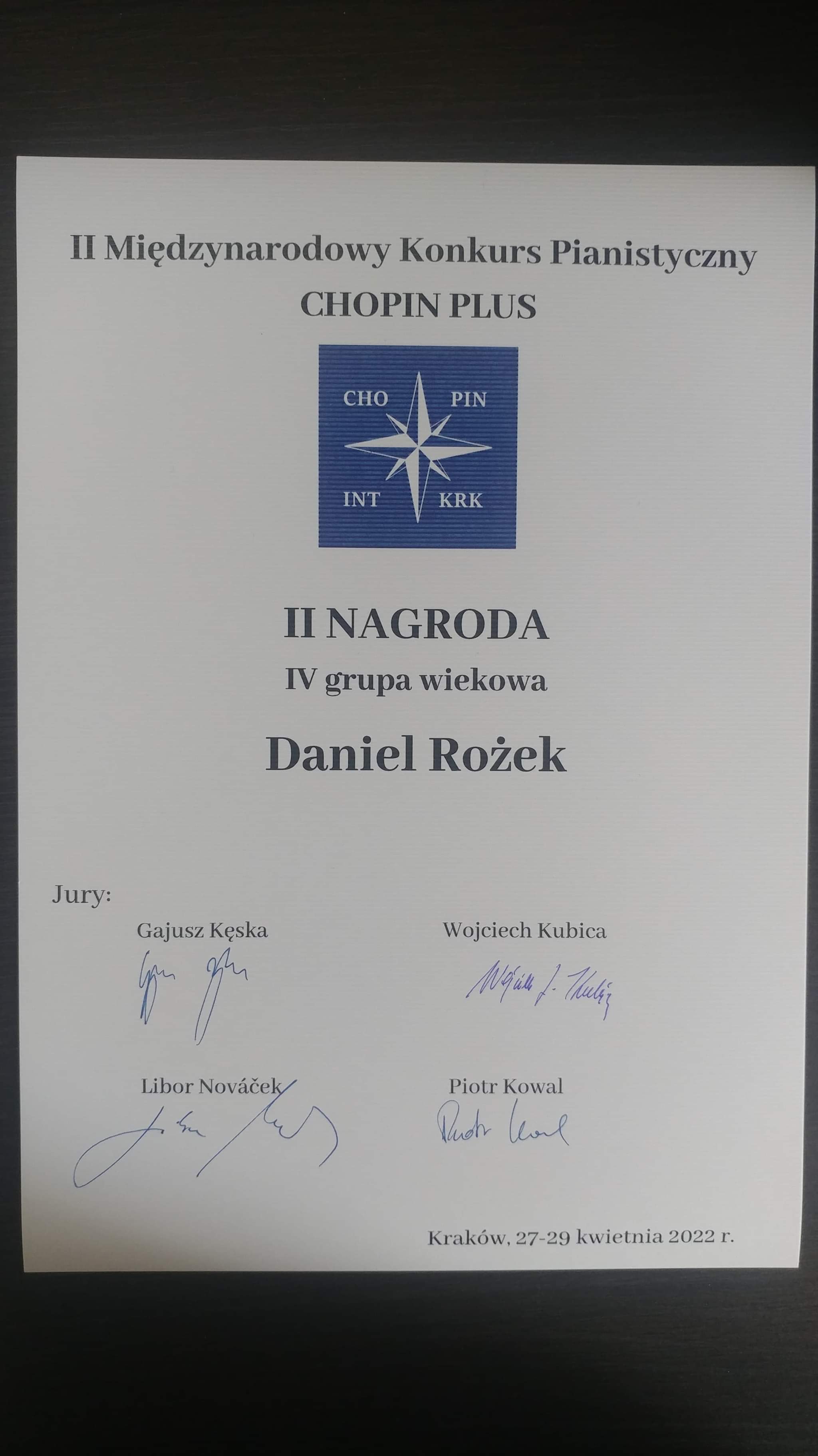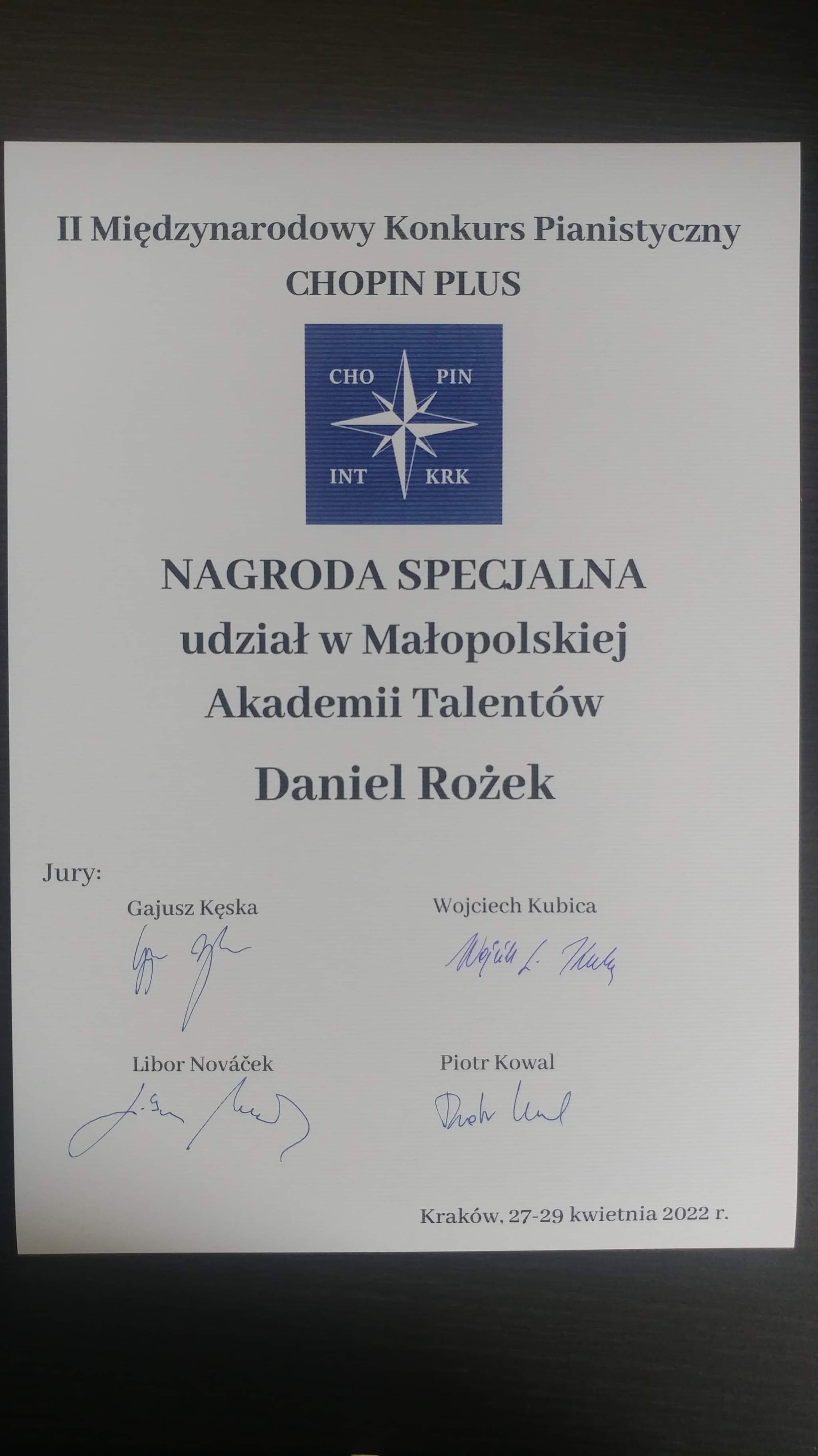 Daniel Rożek na II Międzynarodowym Konkursie Pianistycznym CHOPIN PLUS w Krakowie otrzymał: