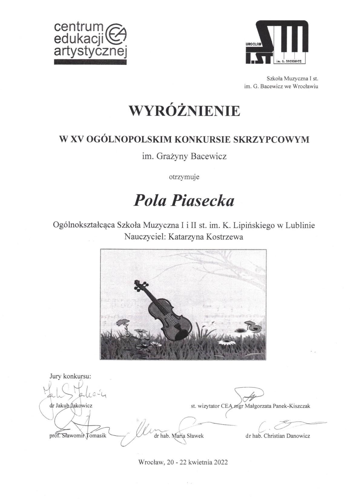 Pola Piasecka zdobyła WYRÓŻNIENIE w XV Ogólnopolskim Konkursie Skrzypcowym im. Grażyny Bacewicz, naucz. Pani Katarzyna Kostrzewa