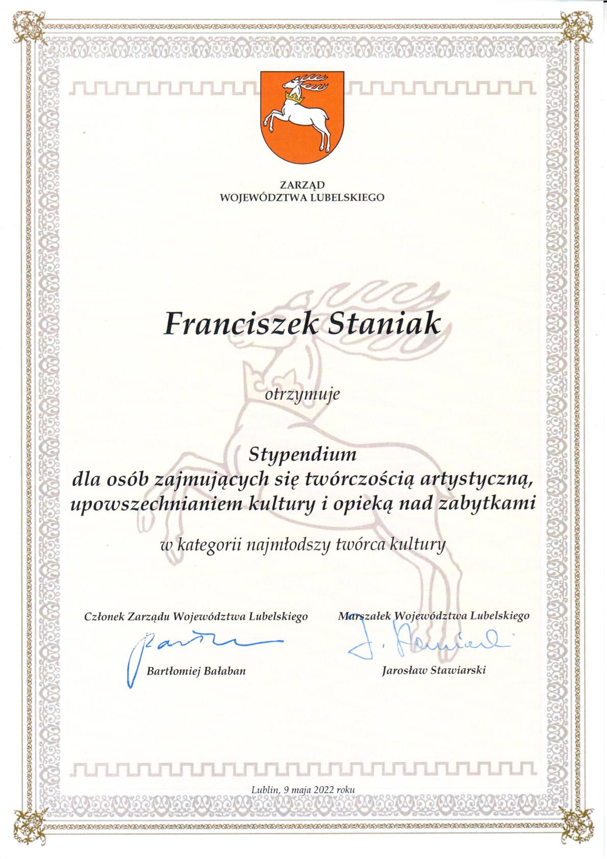 Franciszek Staniak, z klasy akordeonu prof. Elwiry Śliwkiewicz-Cisak otrzymał Stypendium Marszałka Województwa Lubelskiego za osiągnięcia artystyczne w kategorii najmłodszy twórca kultury. Rozdanie stypendiów odbyło się 9 maja 2022 r.