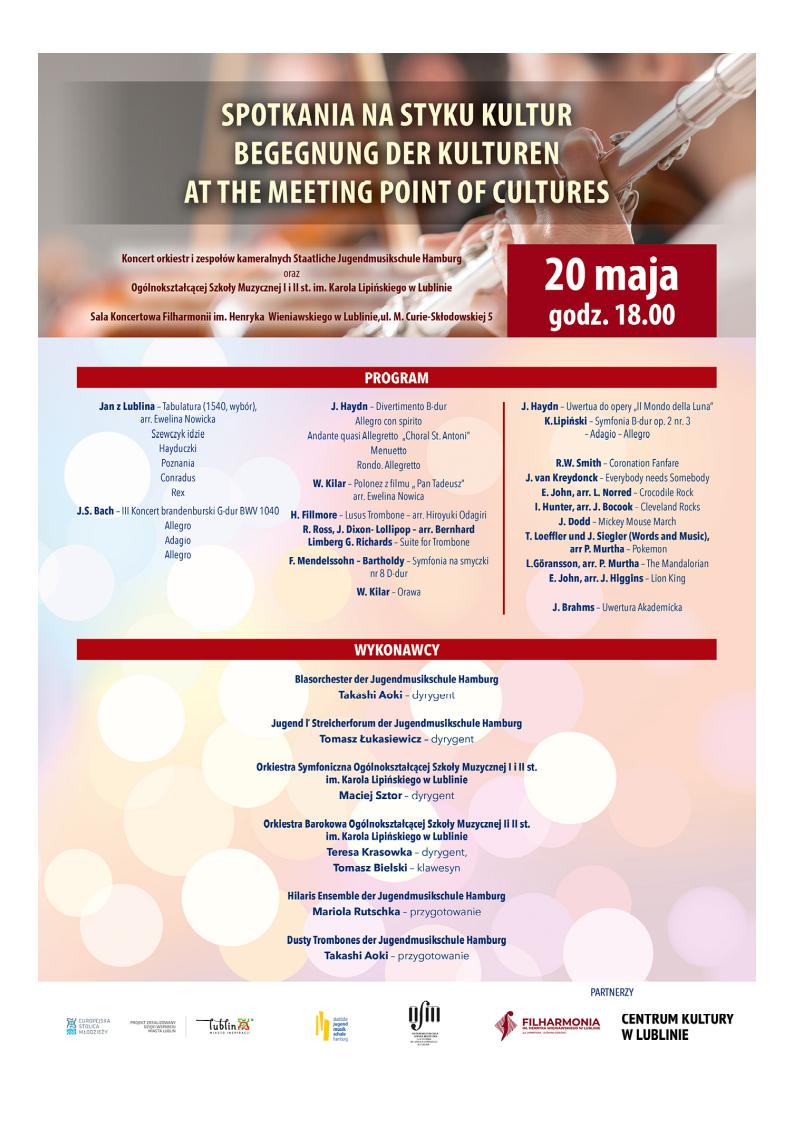 Spotkania na styku kultur begegnung der kulturen at the meeting point of cultures. Koncert orkiestr i zespołów kameralnych Staatliche Jugendmusikschule Hamburg oraz Ogólnokształcąca Szkoła Muzyczna I i II st. im. Karola Lipińskiego w Lublinie. Miejsce: Sala koncertowa Filharmonii im. Henryka Wieniawskiego w Lublinie, ul. M. Curie-Skłodowska 5. Data 20 maja godz. 18:00. Poniżej wypisany program oraz wykonawcy. Na dole loga organizatorów.