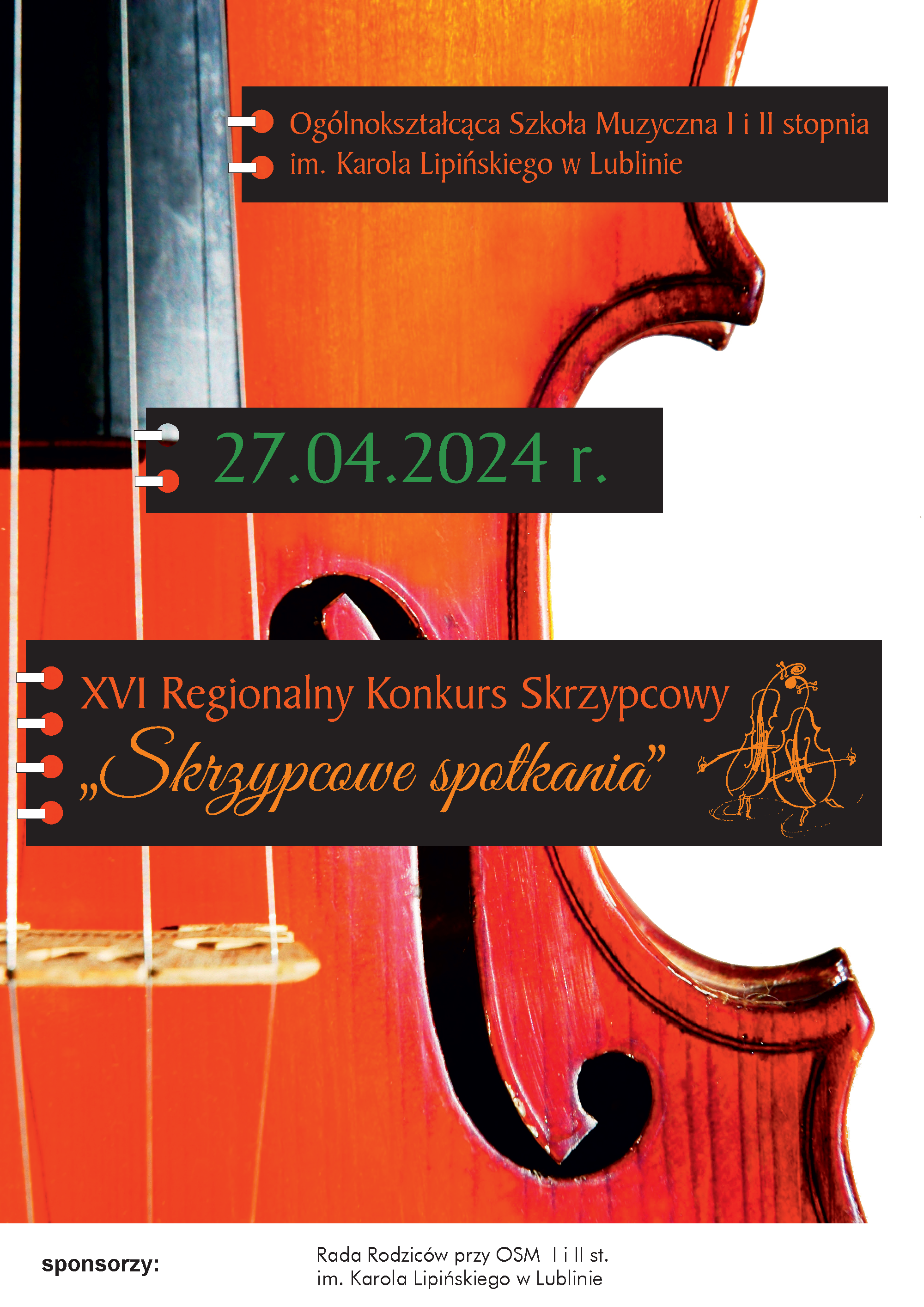 Na obrazku widoczny jest plakat promujący "XVI Regionalny Konkurs Skrzypcowy "Skrzypcowe spotkania'", który ma się odbyć 27.04.2024 r. Plakat charakteryzuje się wyrazistą, zbliżoną fotografią elementów skrzypiec w intensywnym pomarańczowo-czerwonym kolorze. Na górze w czarnym prostokącie znajduje się informacja o organizatorze: Ogólnokształcąca Szkoła Muzyczna I i II stopnia im. Karola Lipińskiego w Lublinie. Centralna część plakatu w czarnym prostokącie z pomarańczowym, stylizowanym tekstem ogłasza nazwę konkursu. Po prawej stronie znajduje się stylizowany rysunek dwóch skrzypiec. Na dole plakatu, zieloną czcionką, podano informacje o dacie: 27 kwietnia 2024 roku. W prawym dolnym rogu znajduje się informacja o