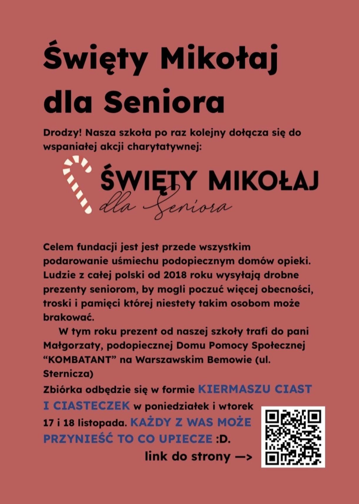 - Następnie przystąpiliśmy do akcji Święty Mikołaj dla Seniora. Zamierzamy wywołać uśmiech u jednej z seniorek obdarowując ją przedświątecznymi prezentami. Dary trafią do Domu Pomocy Społecznej "Kombatant" na warszawskim Bemowie.
