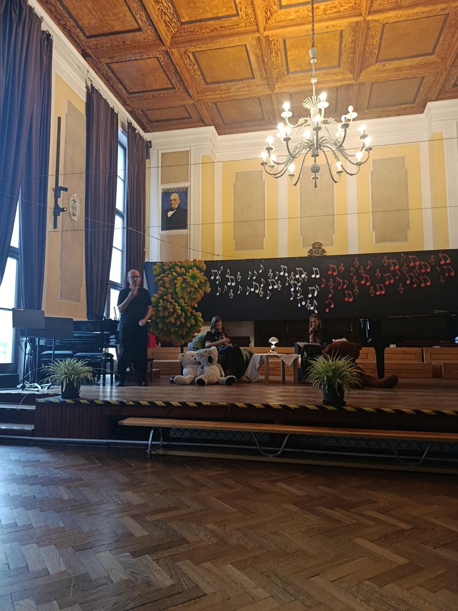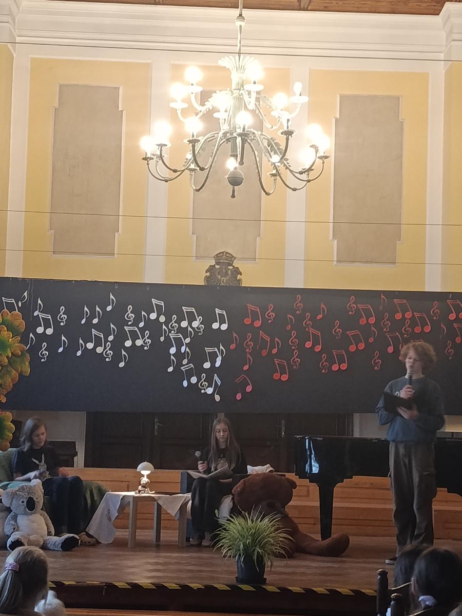 Odczytano też fragment książki Kubuś Puchatek po polsku i po angielsku, z podziałem na role. Fragment tej książki zaprezentowany był też w języku migowym, a jego znajomością pochwalił się nasz nauczyciel Pan Tomasz Januchta.