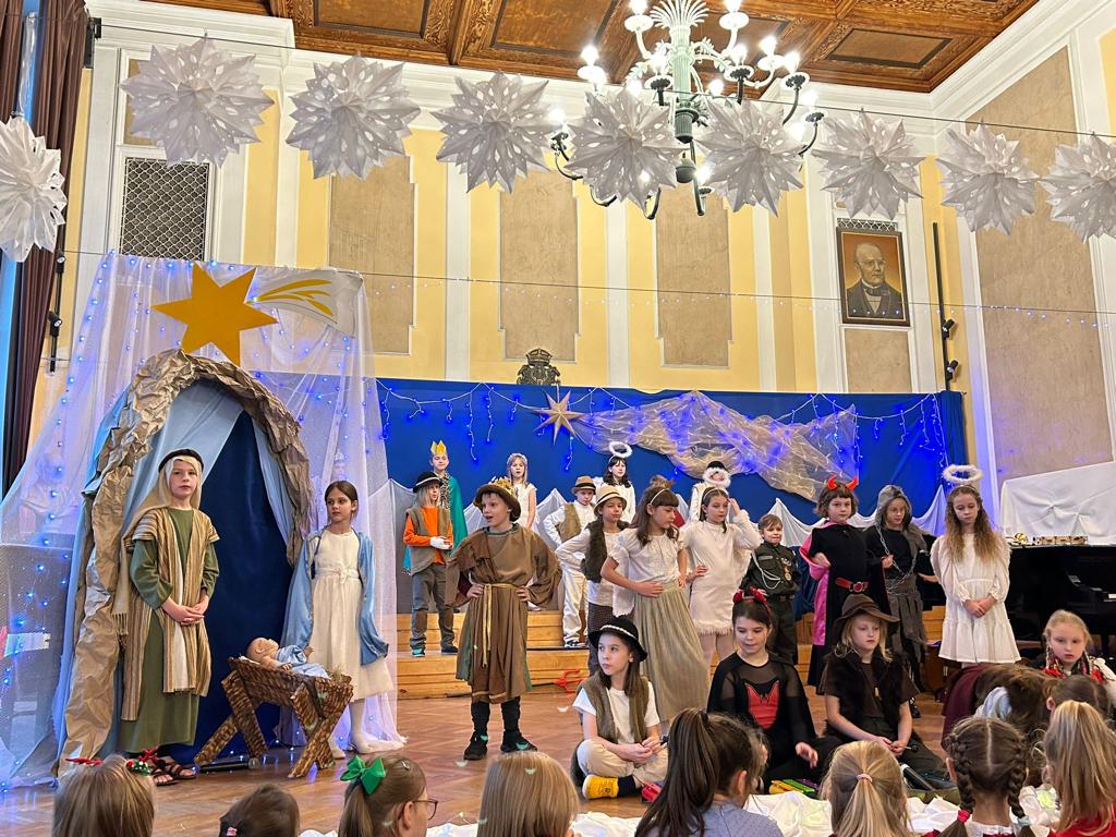 22 grudnia uczniowie klasy 3a i 3b, aby podkreślić wyjątkowy charakter Świąt Bożegonarodzenia, wystawili Jasełka Szkolne. Uczniowie nie tylko przedstawili sceny z narodzin Chrystusa, ale też pięknie zagrali i zaśpiewali niektóre kolędy i pastorałki. Uroczystość przebiegła w miłej i świątecznej atmosferze, a występy w wykonaniu dzieci wprawiły uczestników spotkania w prawdziwie bożonarodzeniowy nastrój.