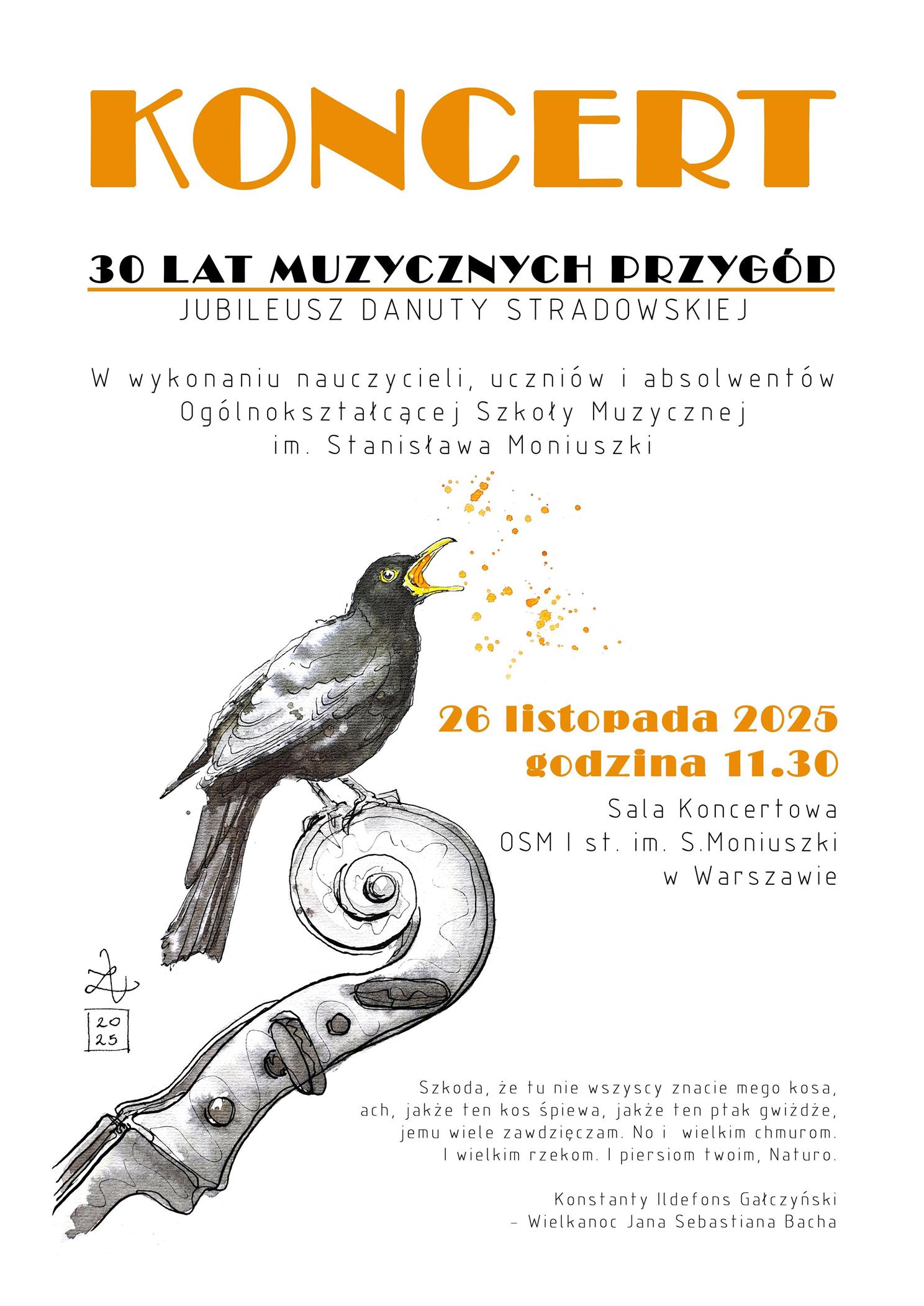 26 listopada 2025 roku o godzinie 11.30 odbędzie się Jubileusz 30-lecia pracy pani Danuty Stradowskiej pt. "30 lat muzycznych przygód".