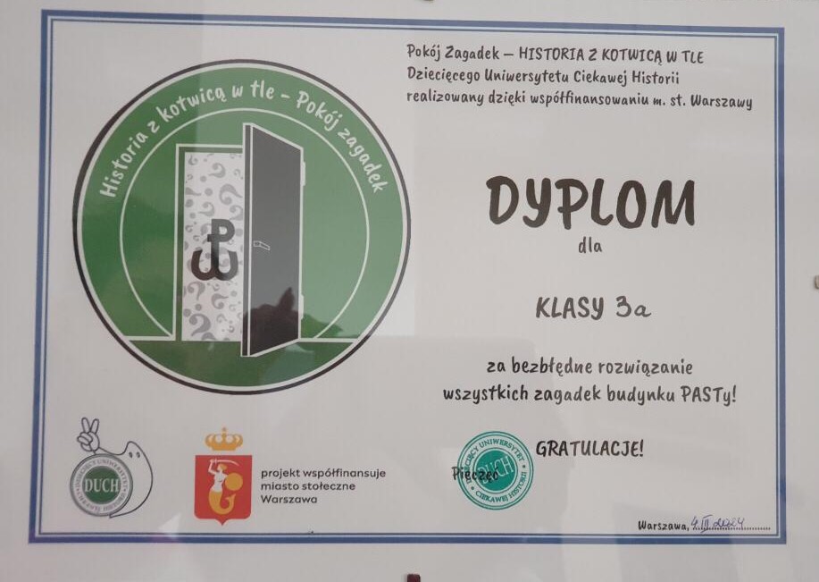 4 marca uczniowie klasy 3a uczestniczyli w zajęciach edukacyjnych ,,Historia z kotwicą w tle”. W historycznym budynku PASTy na uczniów czekał pokój zagadek. Rozwiązując serię zadań i łamigłówek uczniowie dotarli do ciekawych informacji na temat samego budynku oraz roli jaką odegrał podczas Powstania Warszawskiego.
