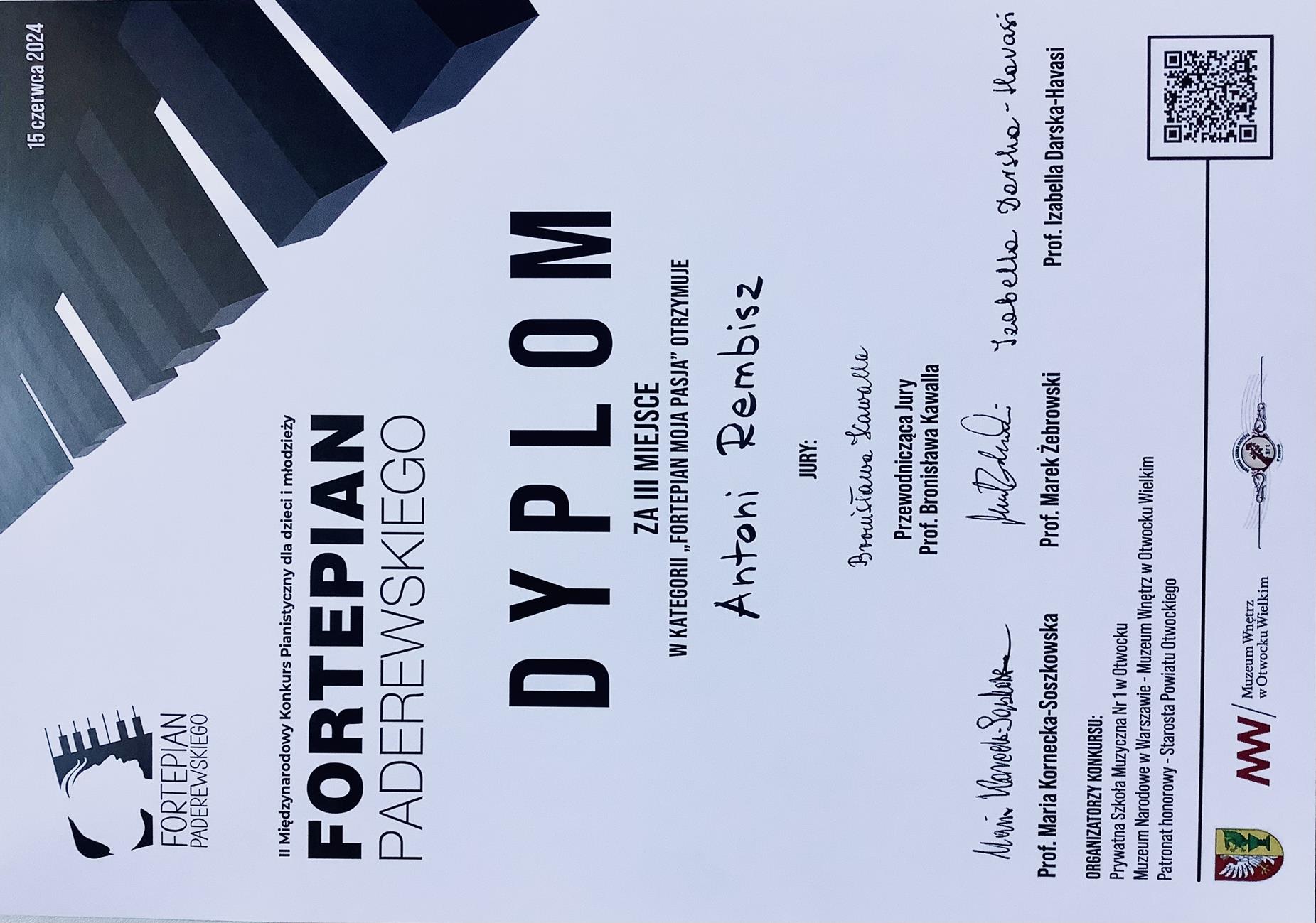 15.06.24 - Antoni zagrał w Finale II Międzynarodowego Konkursu Pianistycznego dla dzieci i młodzieży Fortepian Paderewskiego... gdzie otrzymał III nagrodę!