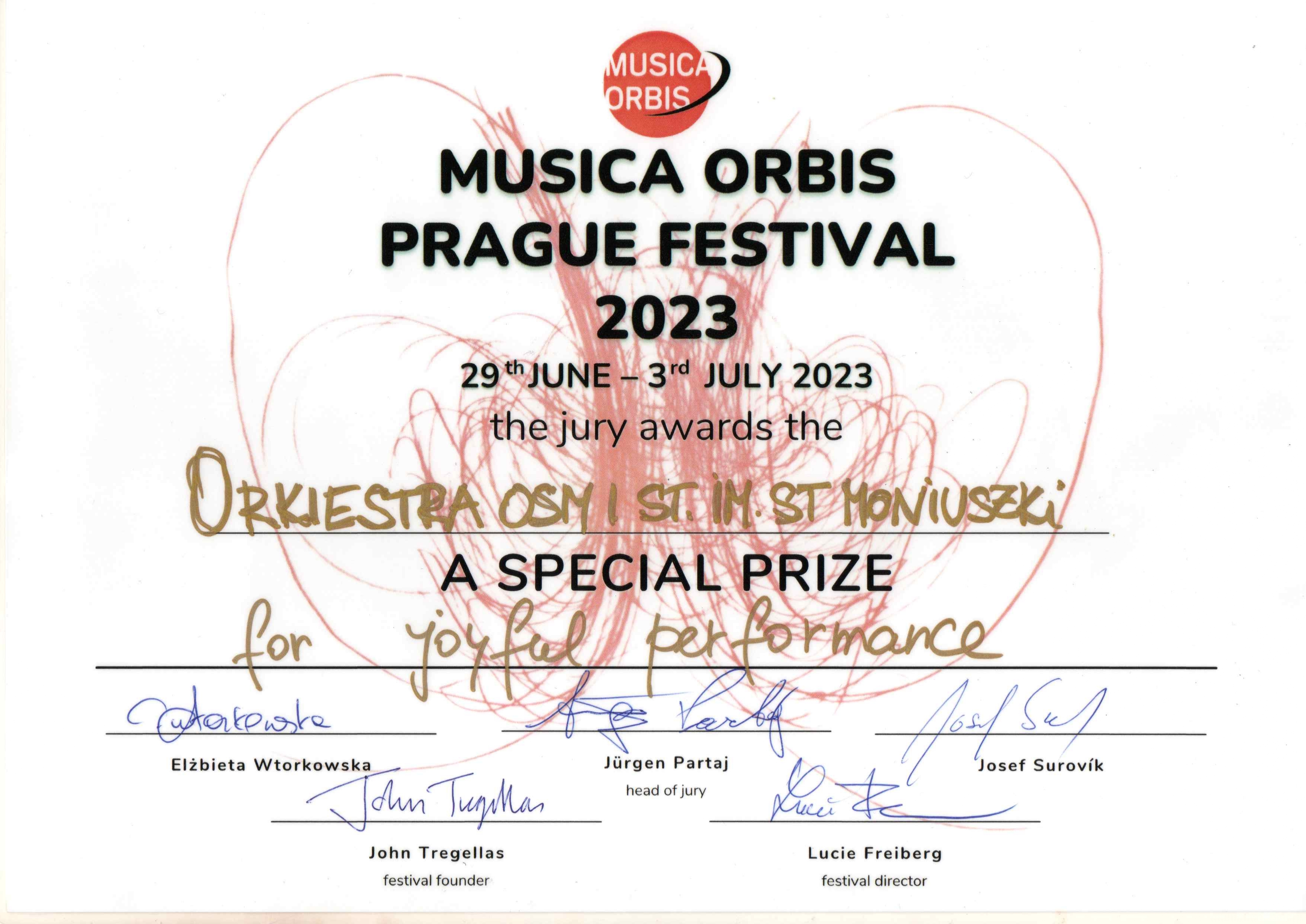 Orkiestra naszej szkoły, pod dyrekcją Pani Anny Sobieckiej, zdobyła Srebrny Medal, oraz Nagrodę Specjalną za najradośniejszy występ na Musica Orbis Festival w Pradze. Gratulujemy kolejnego ogromnego sukcesu