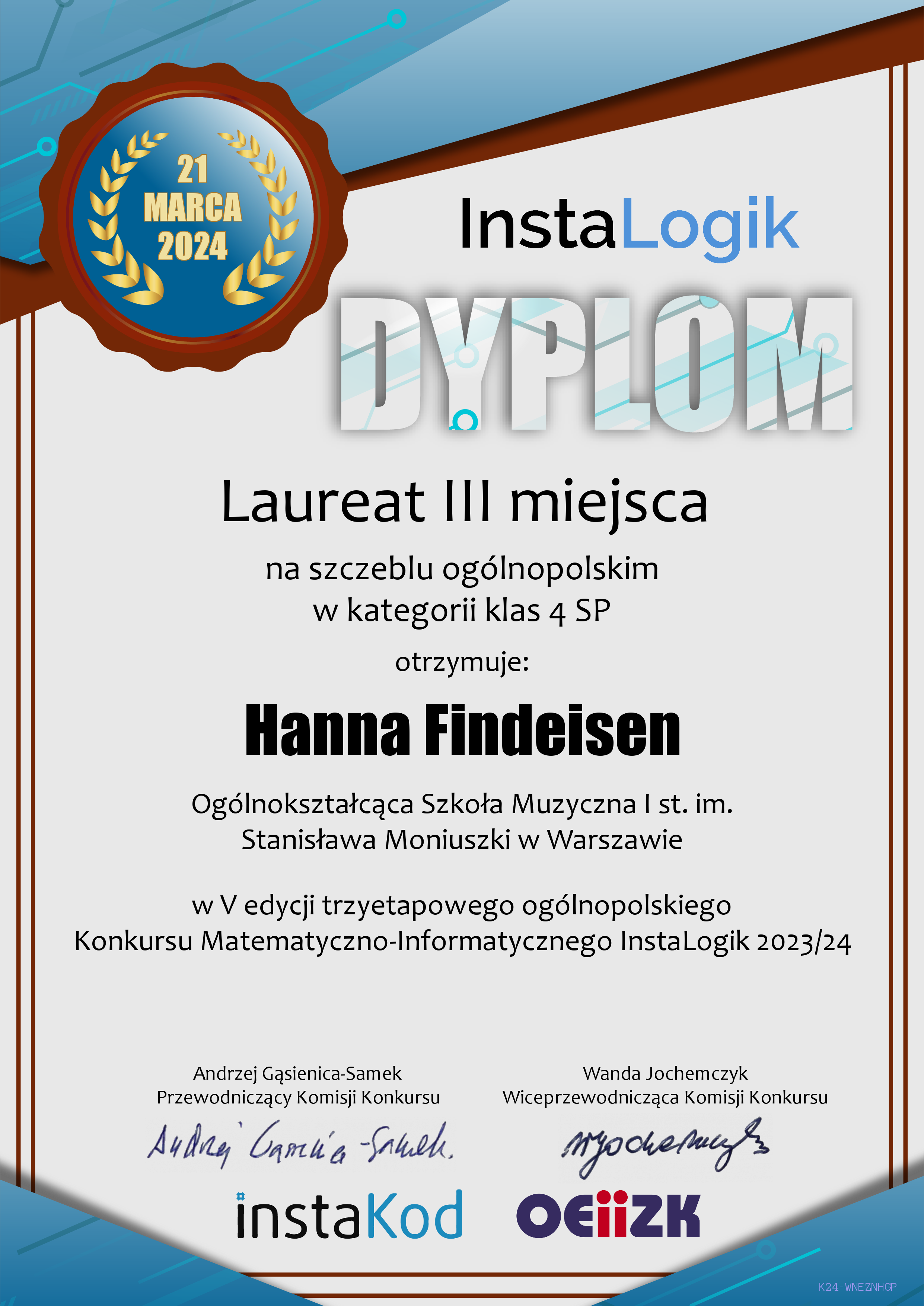 Uczennica naszej szkoły Hanna Findeisen z klasy 4a została laureatką 3 miejsca w kategorii klas 4 w ogólnopolskim trzyetapowym Konkursie Matematyczno-Informatycznym InstaLogik. Była to V edycja tego konkursu.