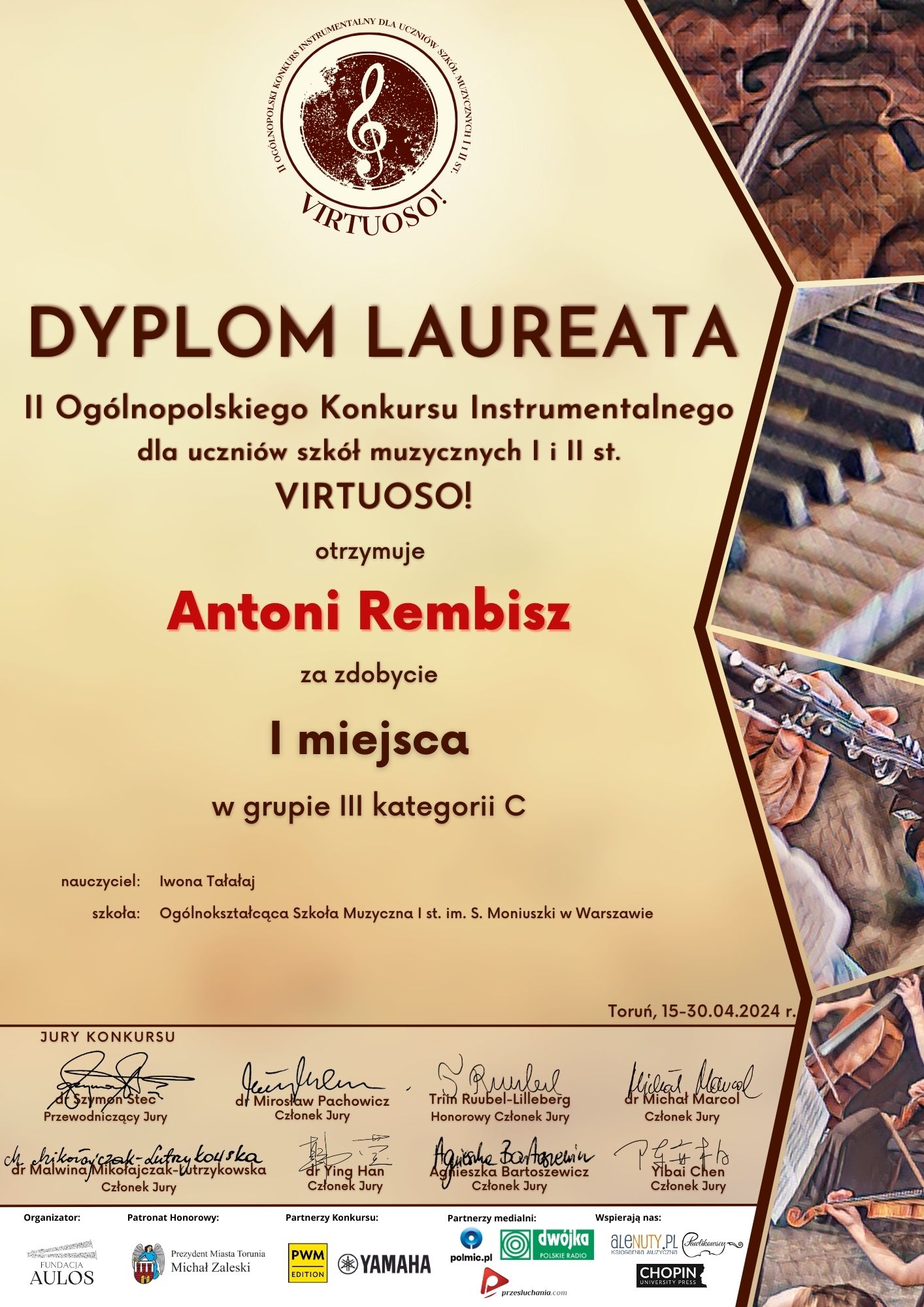 Antoni Rembisz z klasy 5 zdobył I miejsce w grupie III w kategorii C w II Ogólnopolskim Konkursie Instrumentalnym VIRTUOSO dla uczniów szkół muzycznych I i II st.