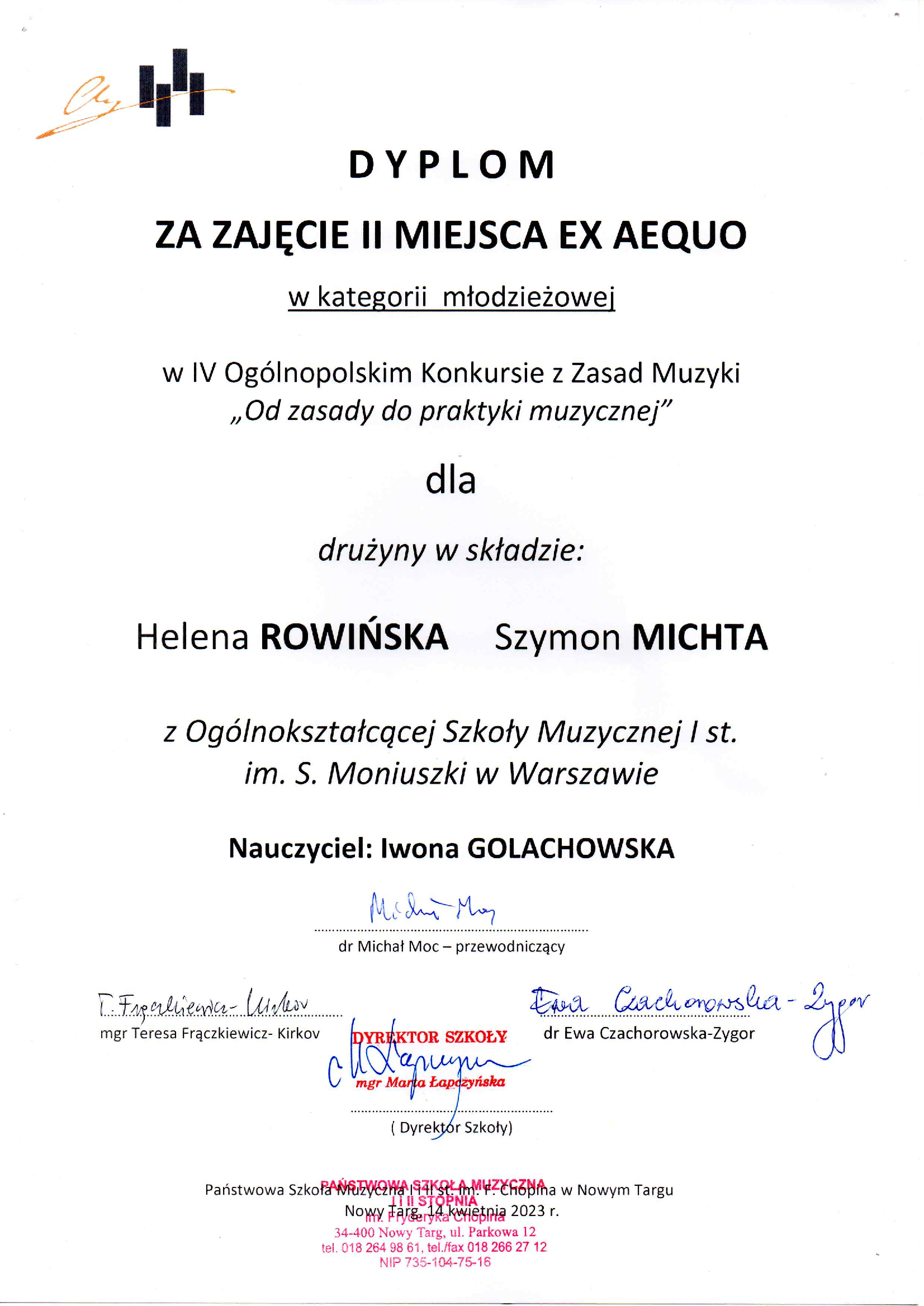 Miło nam poinformować, że uczniowie naszej szkoły Helena Rowińska 8a i Szymon Michta 8b zajęli II miejsce ex aeque w IV Ogólnopolskim Konkursie z Zasad Muzyki pt. "Od zasady do praktyki muzycznej". Uczniów przygotowała Pani Iwona Golachowska.