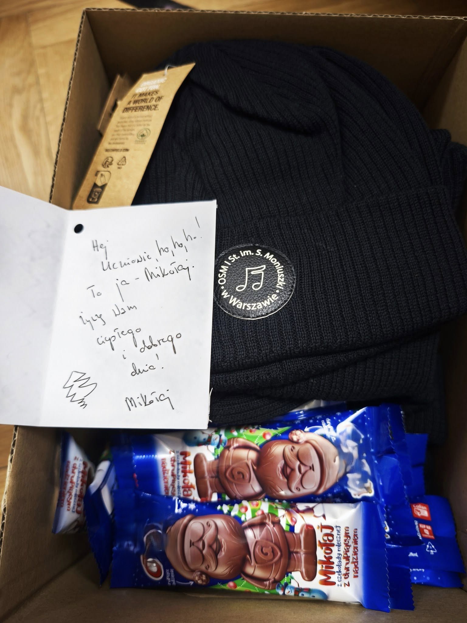 Przedstawiciele rodziców przygotowali dla każdej klasy paczkę, w której uczniowie znaleźli czapki z logo szkoły oraz słodką niespodziankę.