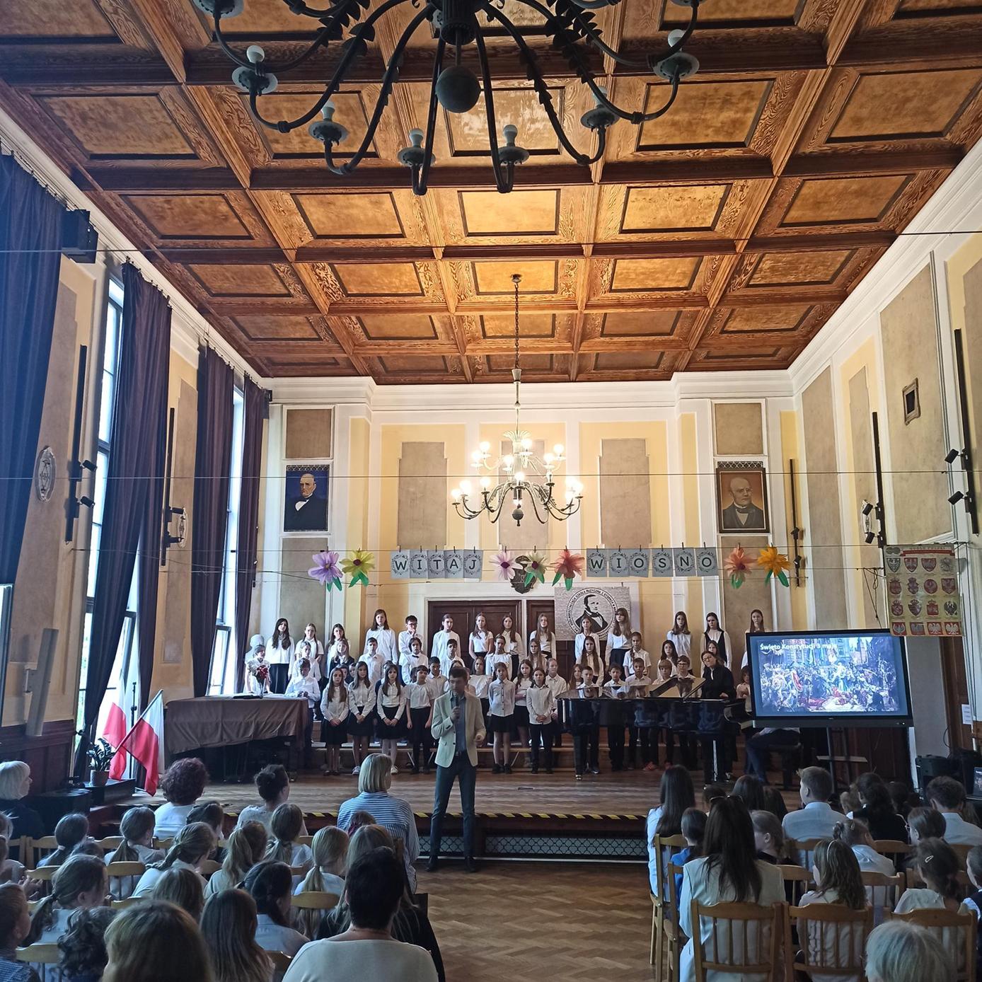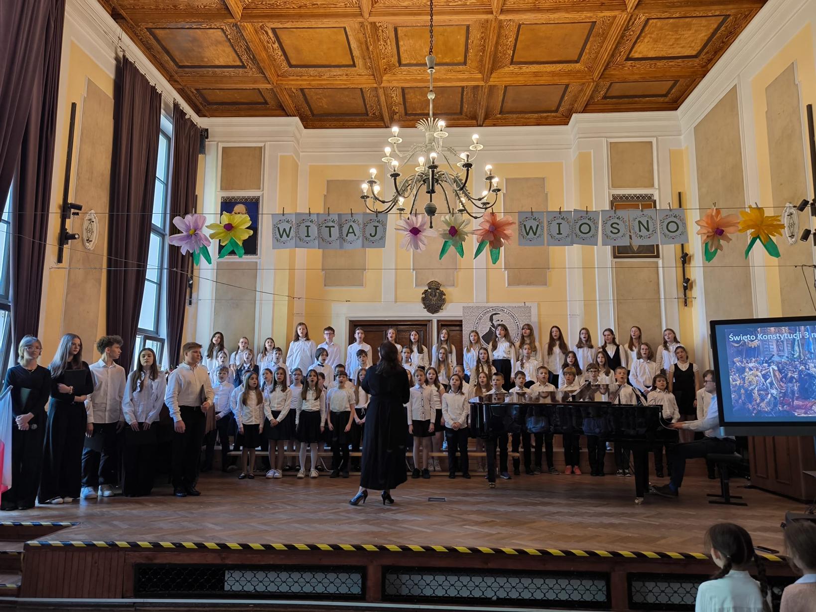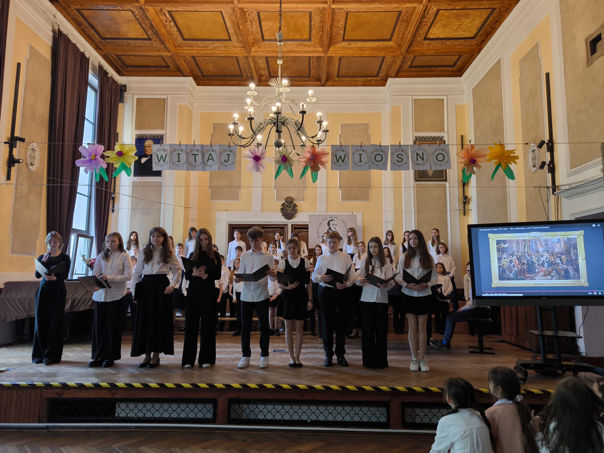 30 kwietnia w naszej szkole uczciliśmy rocznicę uchwalenia Konstytucji 3 Maja. Uczniowie siódmej klasy zaprezentowali rys historyczny tego ważnego dla dziejów Polski wydarzenia. Nie zabrakło oprawy poetyckiej i muzycznej. Tę ostatnią zapewnił chór szkolny pod batutą Pani Anny Sobieckiej.