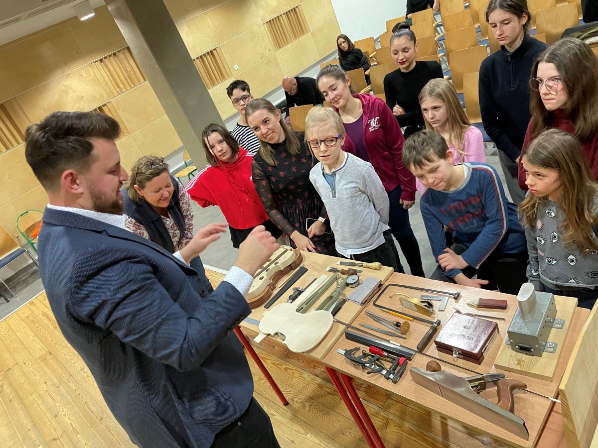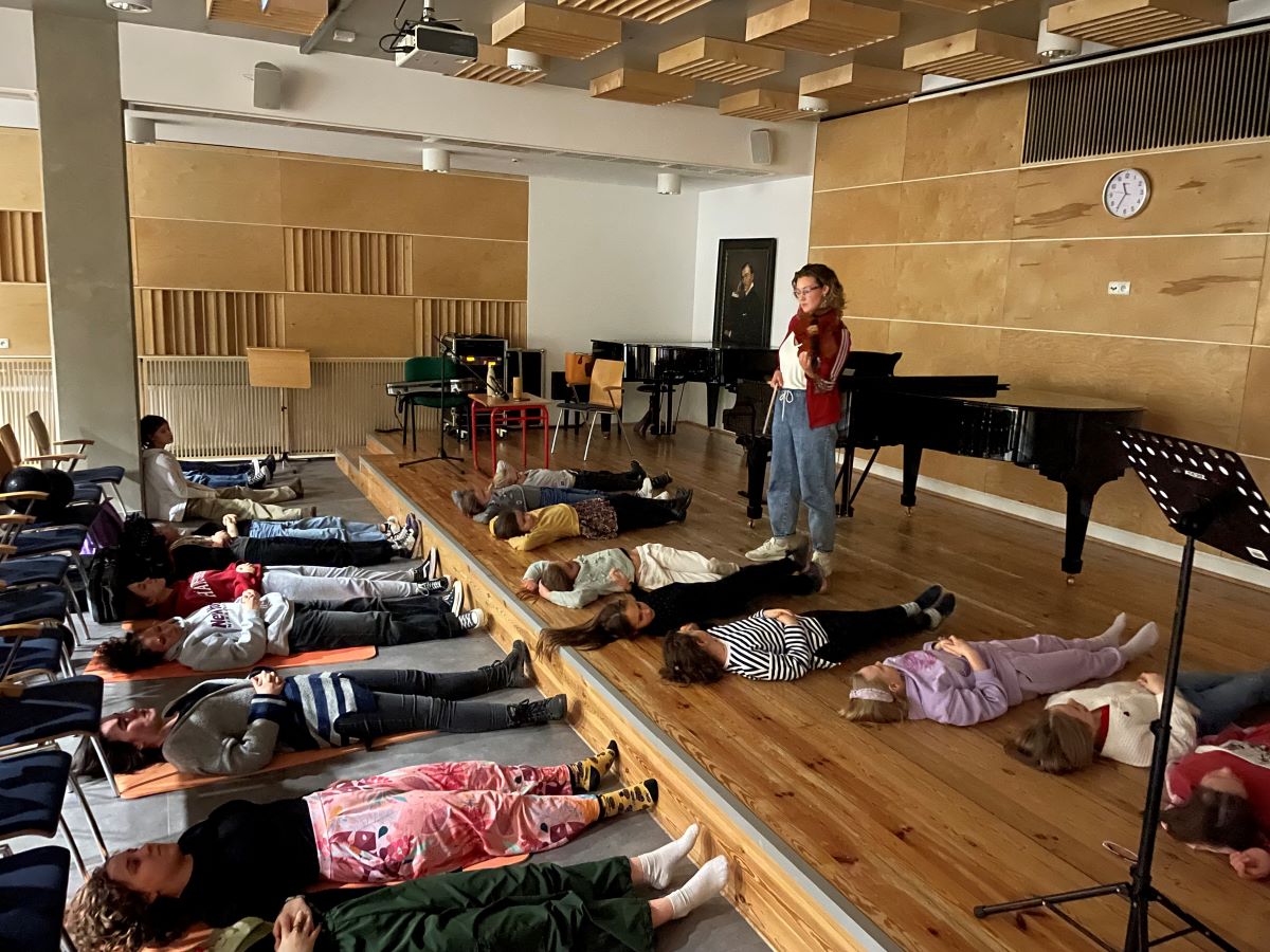 Atrakcji doświadczyliśmy bez liku. Zaczęliśmy dzień od wspólnej gimnastyki, następnie zapoznaliśmy się z twórczością kompozytorów ukraińskich, wyciszaliśmy się leżąc na matach i wsłuchując się w oddech, improwizowaliśmy na podrzucane przez publiczność tematy. Poćwiczyliśmy vibrato, spojrzeliśmy z bliska na narzędzia jakimi posługuje się lutnik, poznaliśmy barwne oblicza altówki, nauczyliśmy się czegoś nowego o kwintach i najważniejszych aspektach gry na wiolonczeli. Czyż to nie brzmi jak prawdziwy maraton?