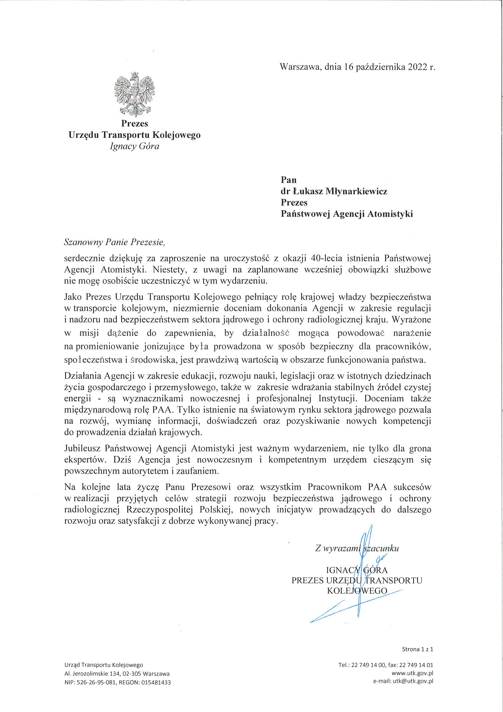 W obchodach 40-lecia utworzenia PAA uczestniczyli przedstawiciele Rady Ministrów na czele z minister klimatu i środowiska Anną Moskwą oraz sekretarzem stanu, pełnomocnikiem Rządu ds. Strategicznej Infrastruktury Energetycznej Mateuszem Bergerem, instytucje współpracujące i partnerzy PAA, a także byli oraz obecni pracownicy Agencji. Z okazji jubileuszu PAA Prezes Rady Ministrów Matuesz Morawiecki wystosował list, który odczytał minister Mateusz Berger (pełna treść listu poniżej).