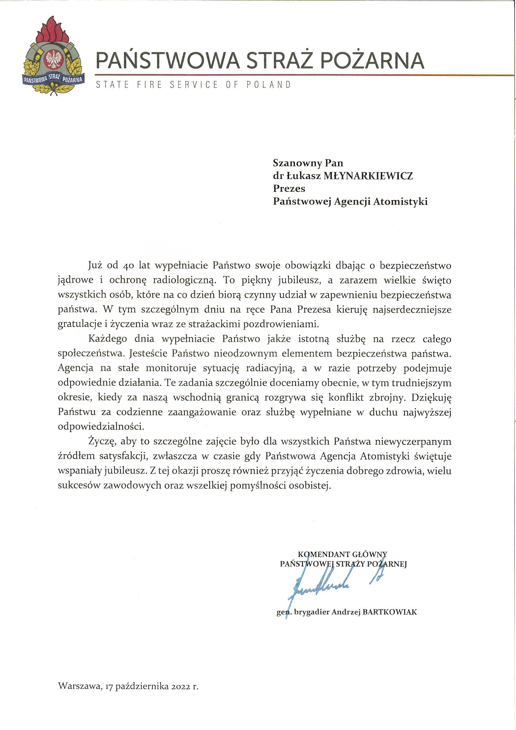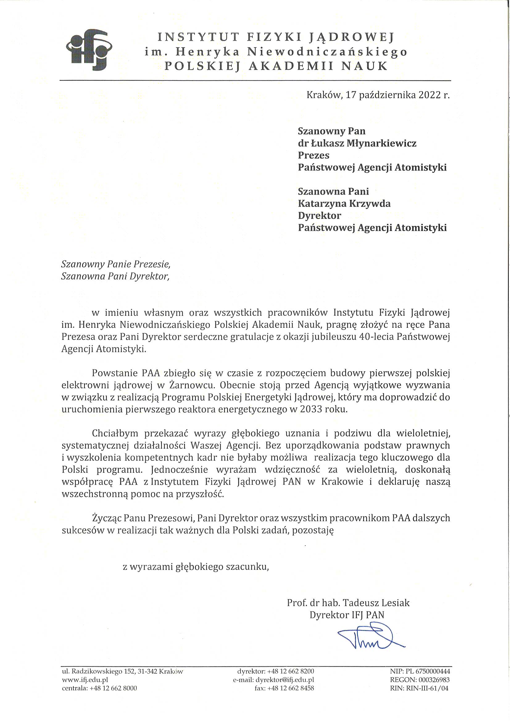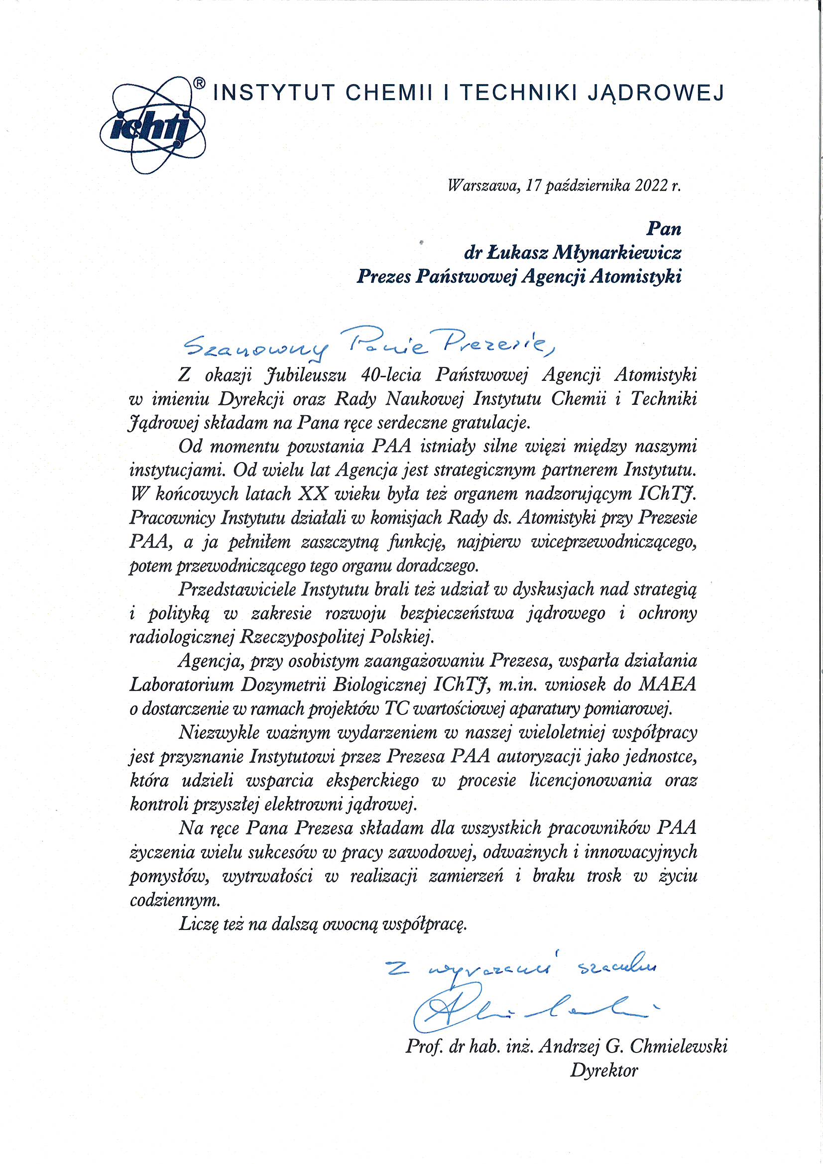 PAA współpracuje również z wieloma zagranicznymi dozorami jądrowymi. Z okazji jubileuszu kilku bliskich partnerów przekazało PAA okolicznościowe pozdrowienia:
