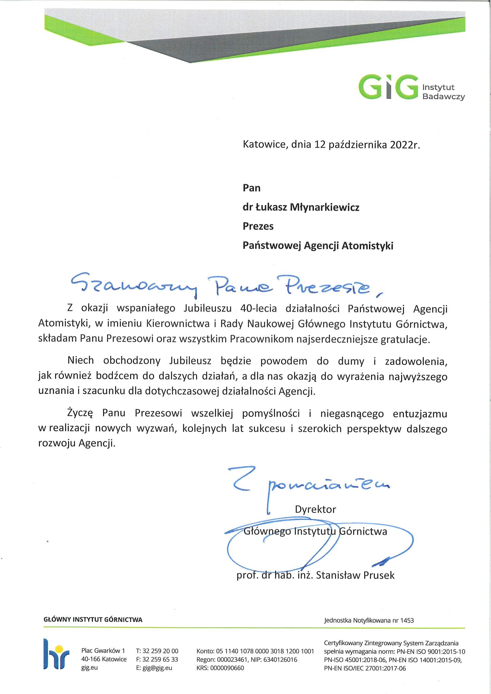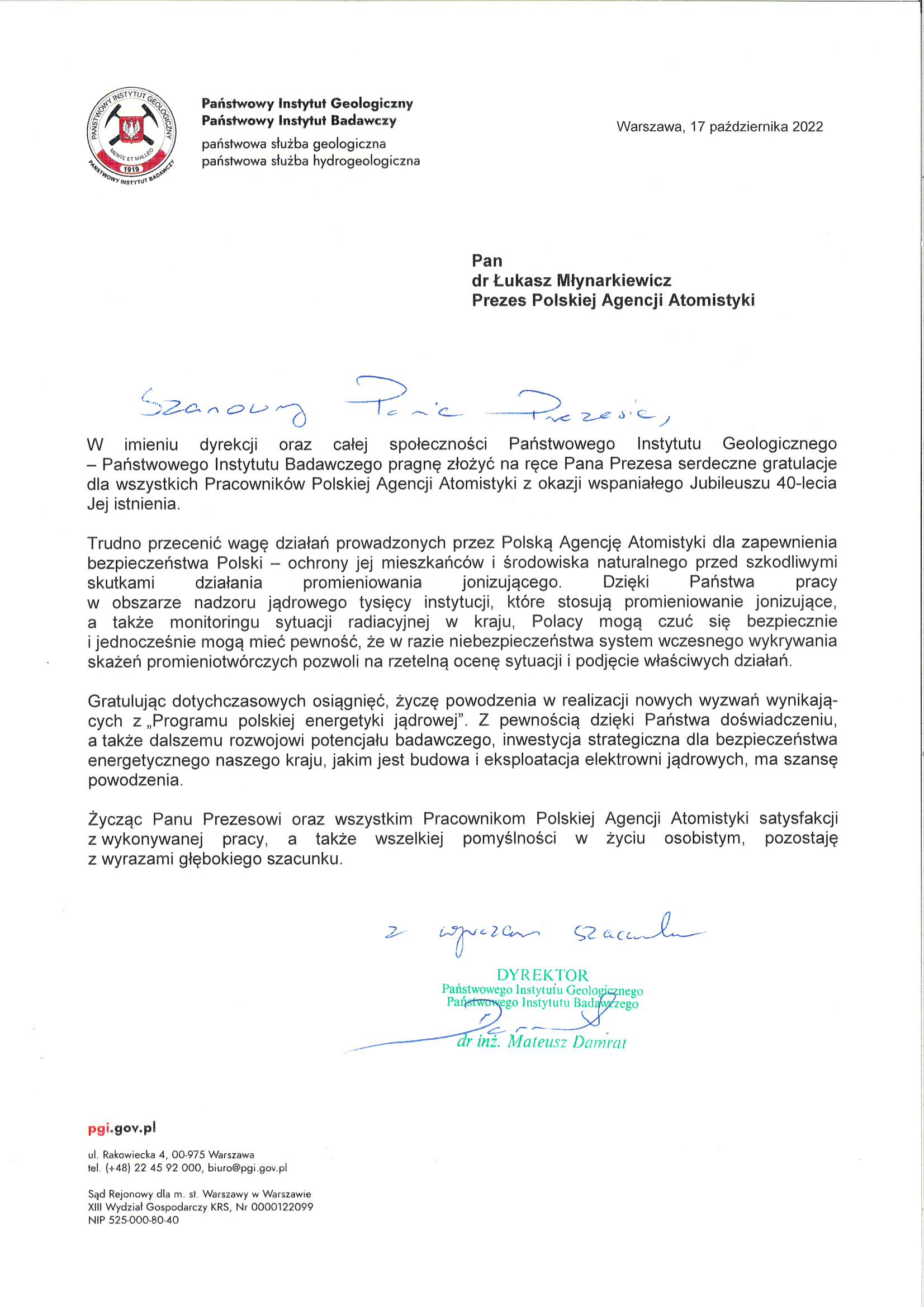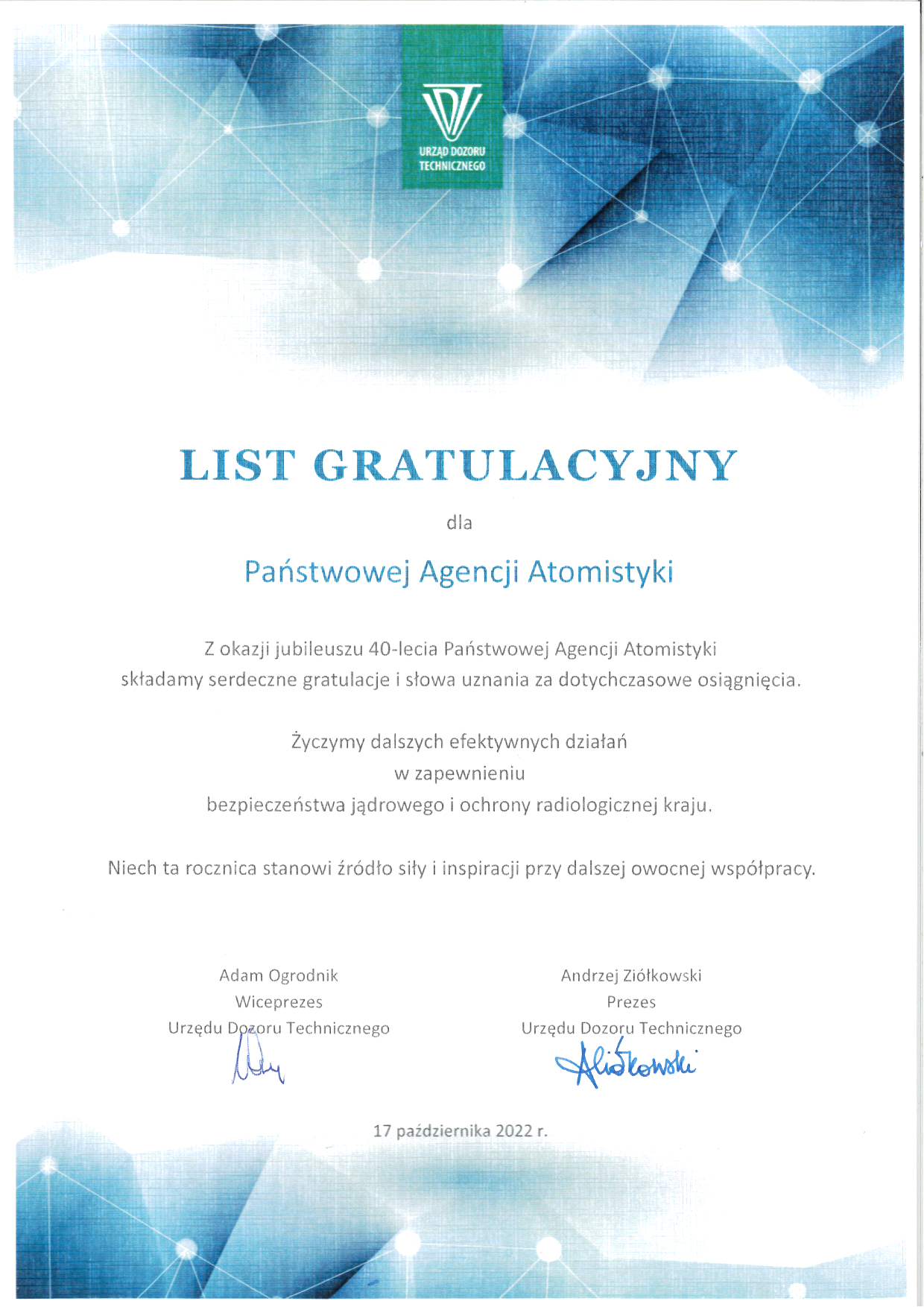 PAA współpracuje również z wieloma zagranicznymi dozorami jądrowymi. Z okazji jubileuszu kilku bliskich partnerów przekazało PAA okolicznościowe pozdrowienia: