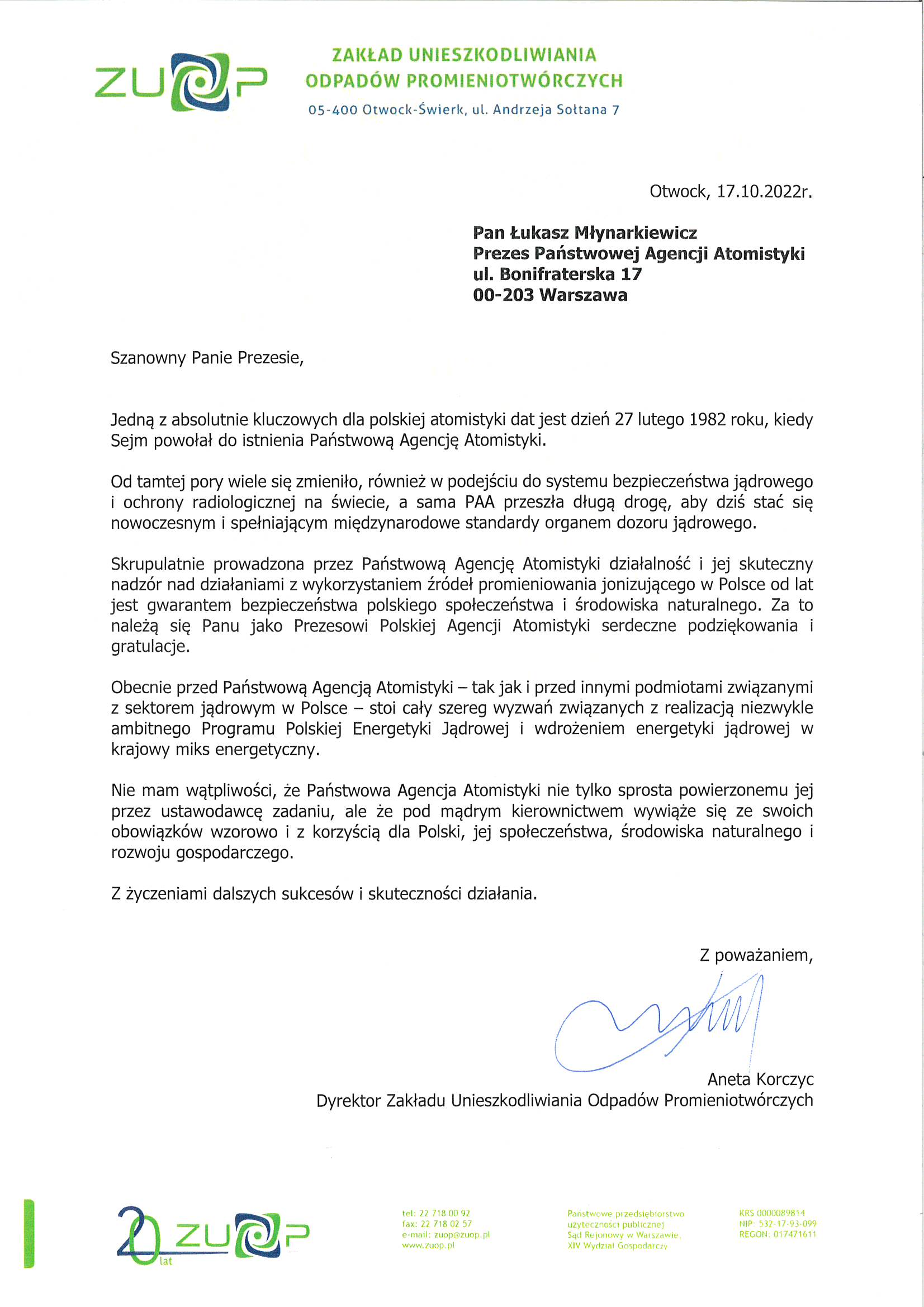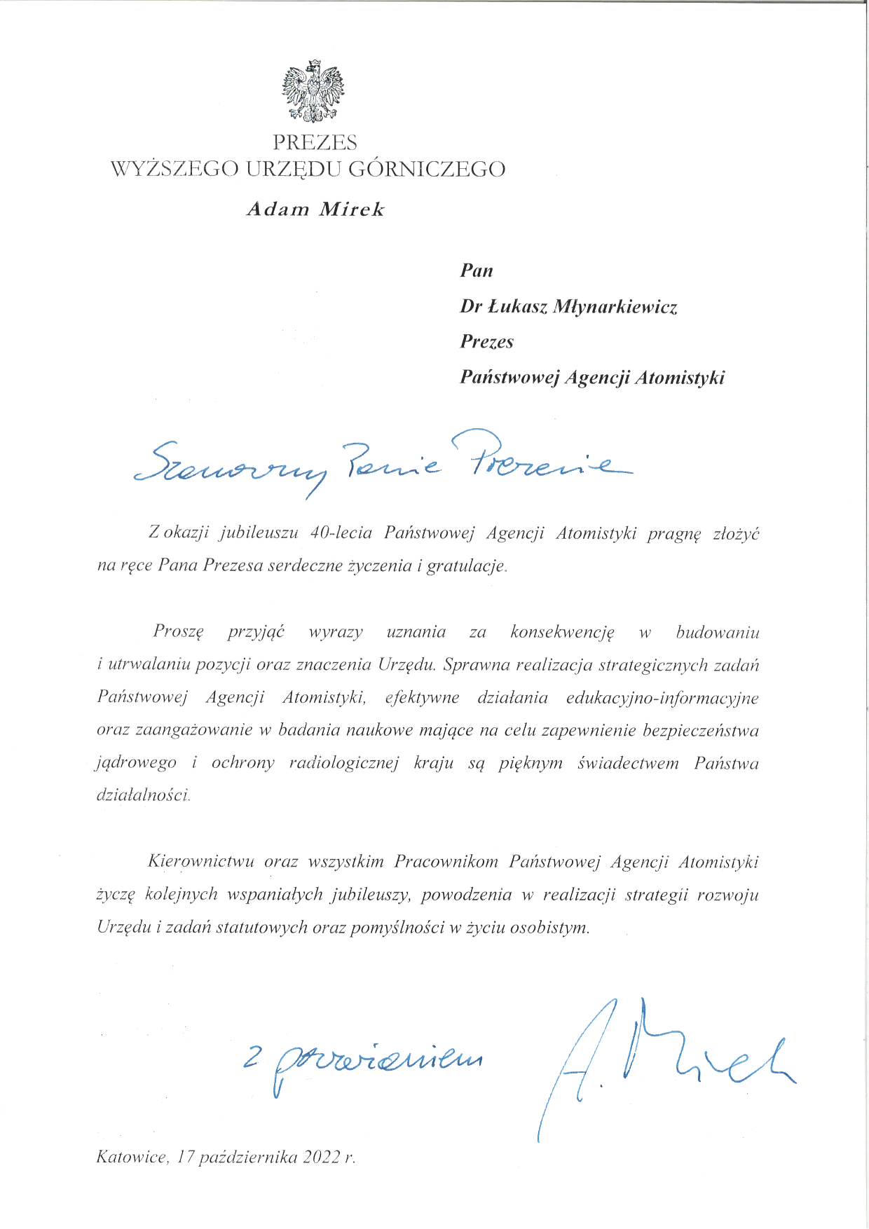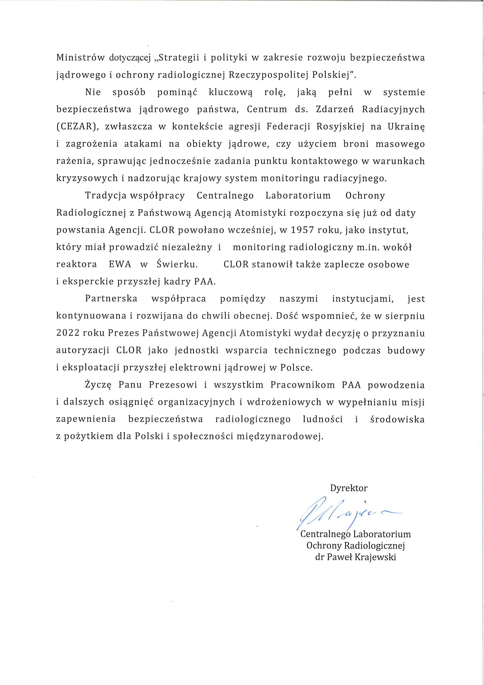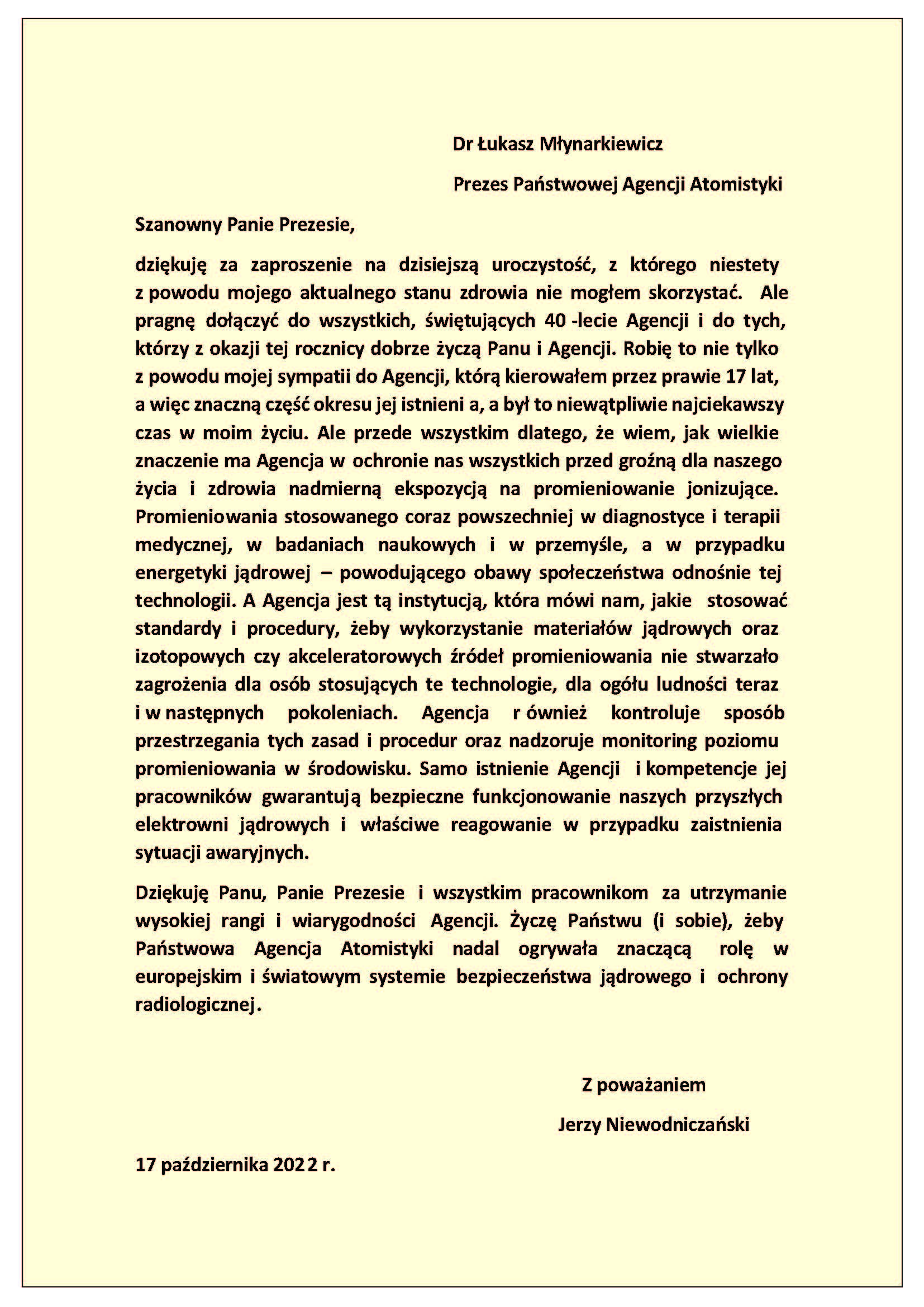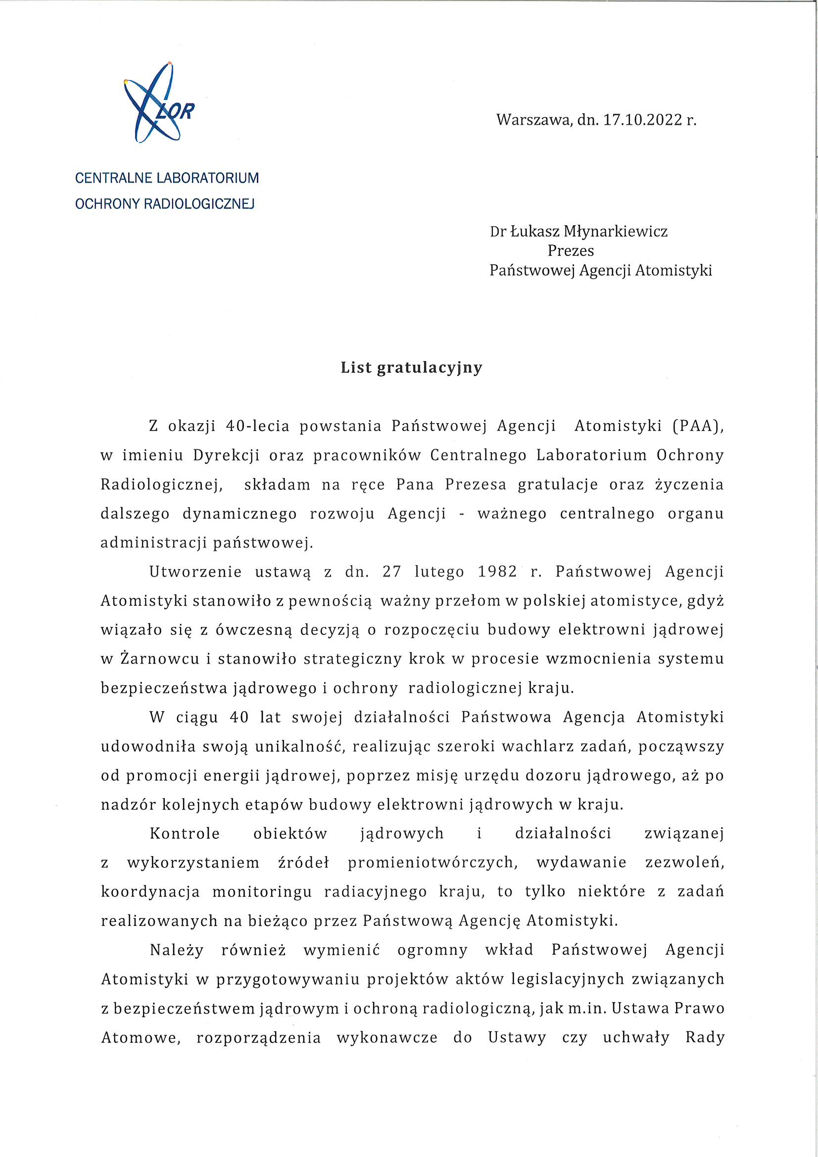 Ustawa o utworzeniu PAA została uchwalona 27 lutego 1982 r. Weszła w życie 9 marca 1982 r., ale agresja wojsk Federacji Rosyjskiej w Ukrainie uniemożliwiła organizację jubileuszu na przełomie lutego i marca – przypomniał Prezes Państwowej Agencji Atomistyki dr Łukasz Młynarkiewicz. – Zdecydowaliśmy wówczas o odłożeniu tej uroczystości – mówił Prezes PAA. – Od tamtego czasu podjęliśmy szereg ważnych inicjatyw, aby wzmocnić poczucie bezpieczeństwa Polaków, chociażby przez wzmocnienie monitoringu radiacyjnego kraju. Ale to też działania w wymiarze międzynarodowym, gdzie minister klimatu i środowiska oraz służby MSZ z naszą pomocą doprowadziły do podjęcia dwóch, historycznych rezolucji na forum Międzynarodowej Agencji Energii Atomowej. Rezolucji przeciwko Federacji Rosyjskiej oraz wzywających do zaprzestania okupowania terenu Zaporoskiej Elektrowni Jądrowej – informował dr Łukasz Młynarkiewicz.
