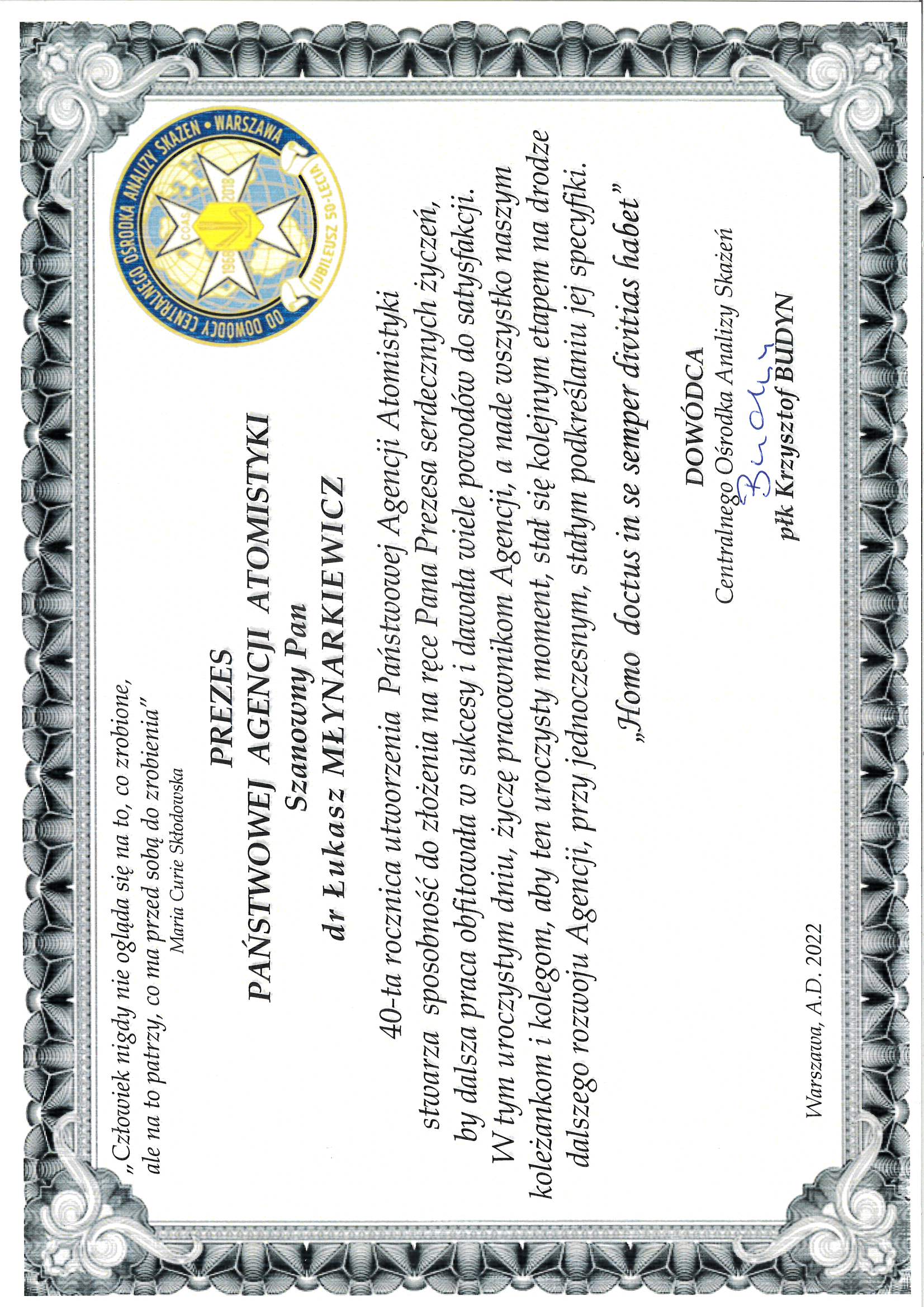 W uznaniu osiągnięć na rzecz bezpieczeństwa jądrowego i ochrony radiologicznej oraz wkład w rozwój działalności Państwowej Agencji Atomistyki Prezes PAA przyznał odznakę okolicznościową – Odznakę Czterdziestolecia Utworzenia Państwowej Agencji Atomistyki. Odznakę odebrały: