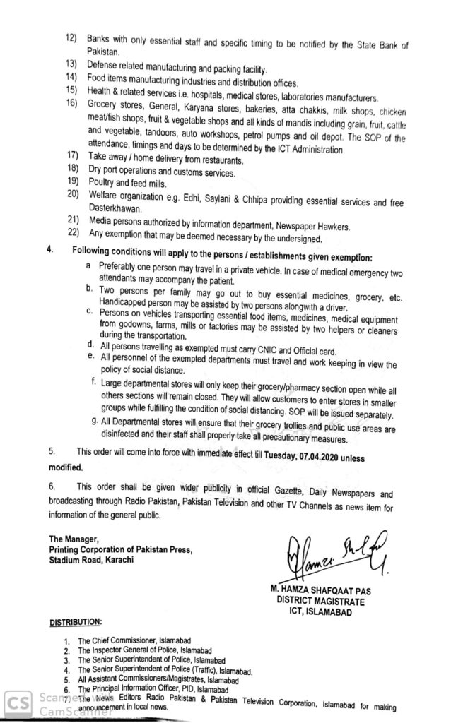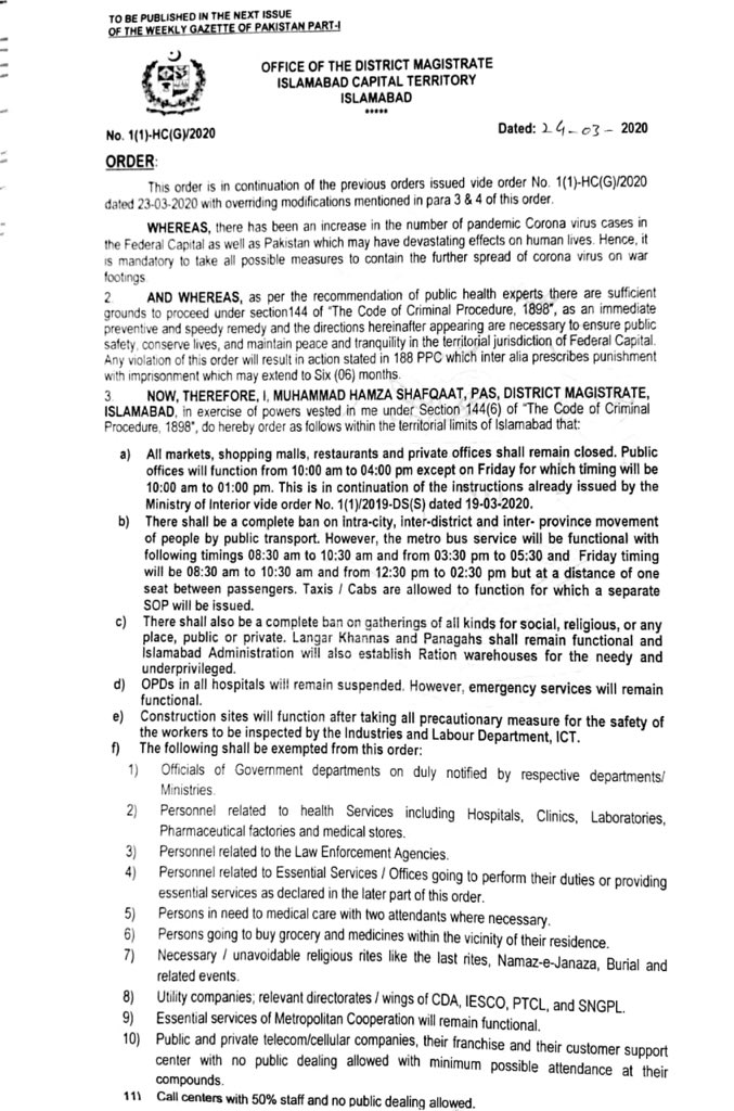 W związku z rosnącym zagrożeniem Covid-19 w Pakistanie, na terenie miasta stołecznego Islamabad, zostały wprowadzone następujące ograniczenia: