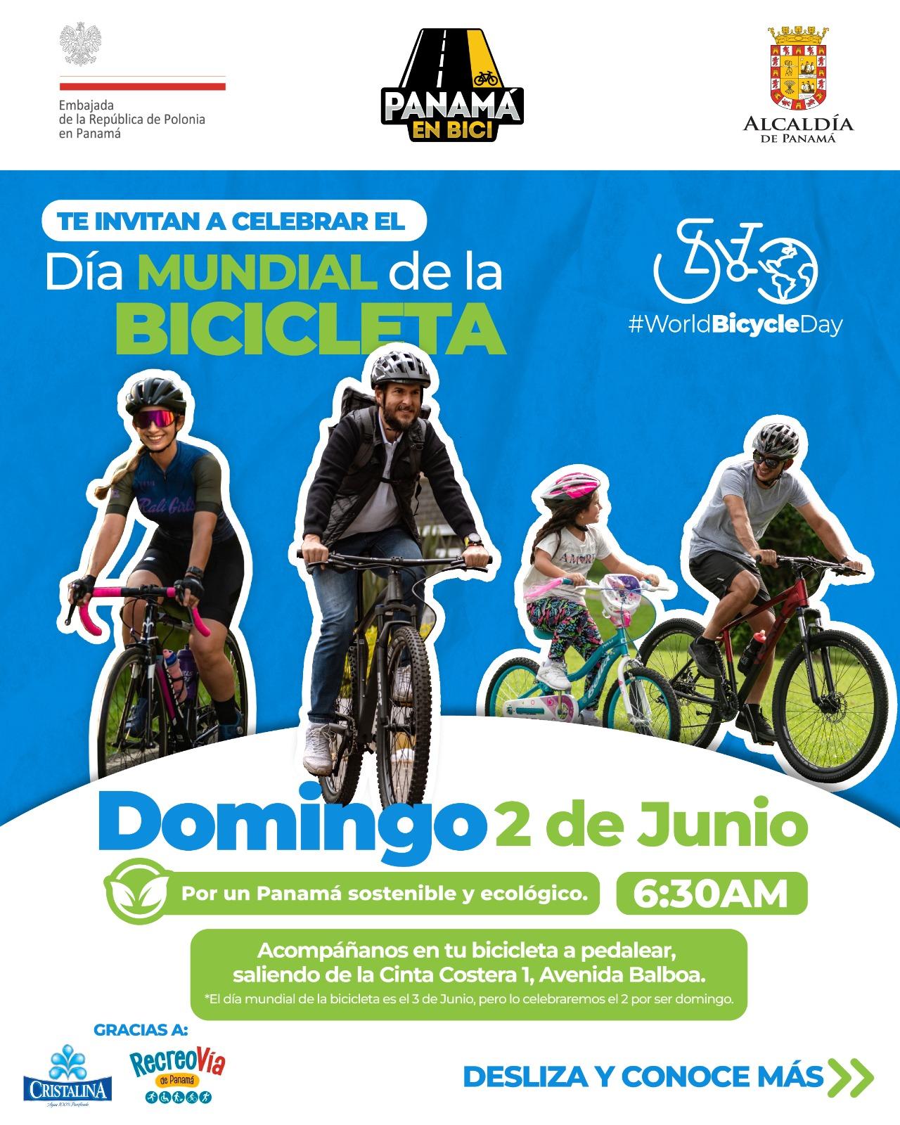 Les invitamos a celebrar la 4ta edición del Día Mundial de la Bicicleta en Panamá, el Domingo 02 de junio de 2024 a las 6:30 a.m., en la Cinta Costera de la ciudad de Panamá. El evento lo hemos organizado junto a la Fundación Panamá en Bici y la Alcaldía de Panamá. El evento incluirá una parte oficial que inicie a las 7:00 a.m. con las palabras dirigidas a las nuevas autoridades panameñas electas a nivel nacional y municipal.