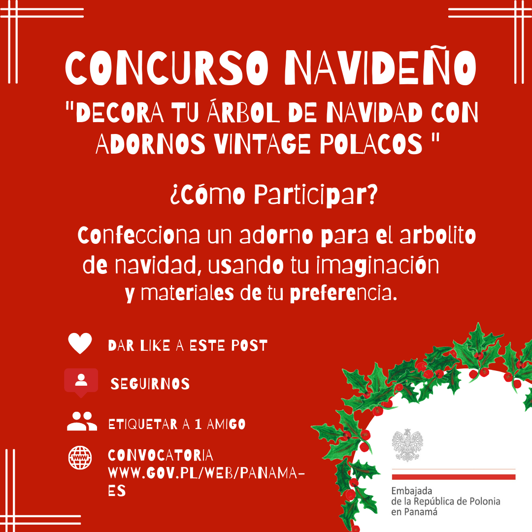 En nuestras redes sociales: Twitter: @plenpanama e Instagram: @plinpanama se anunció un concurso de arte dirigido a niños y jóvenes en edades comprendidas de 5 a 15 años de edad, de cualquier nacionalidad, residentes en el territorio de Panamá. El concurso consiste en confección de un (01) adorno vintage polaco para árbol de navidad, haciendo uso de materiales de su elección y su libre creatividad. En los posts de las redes sociales de la embajada publicamos artes de las cuales podrán tomar ideas para realizar un adorno y participar en nuestro concurso.
