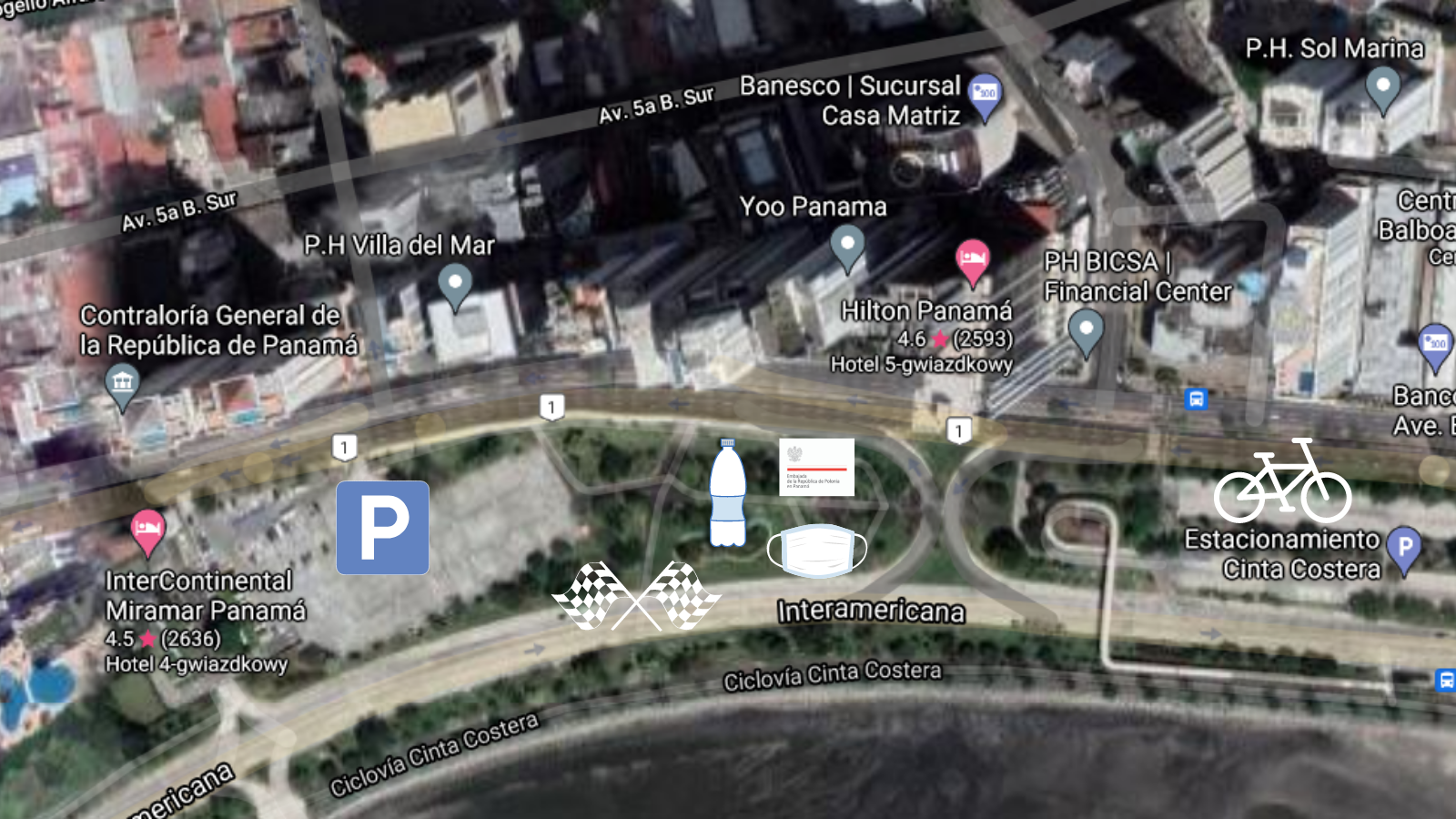 - Adjunto vean el mapa del evento en el que se indica: localización de estacionamiento público al lado del hotel Miramar, inicio y meta del recorrido, punto de hidratación y entrega de las mascarillas, estacionamiento donde se puede alquilar las bicicletas.