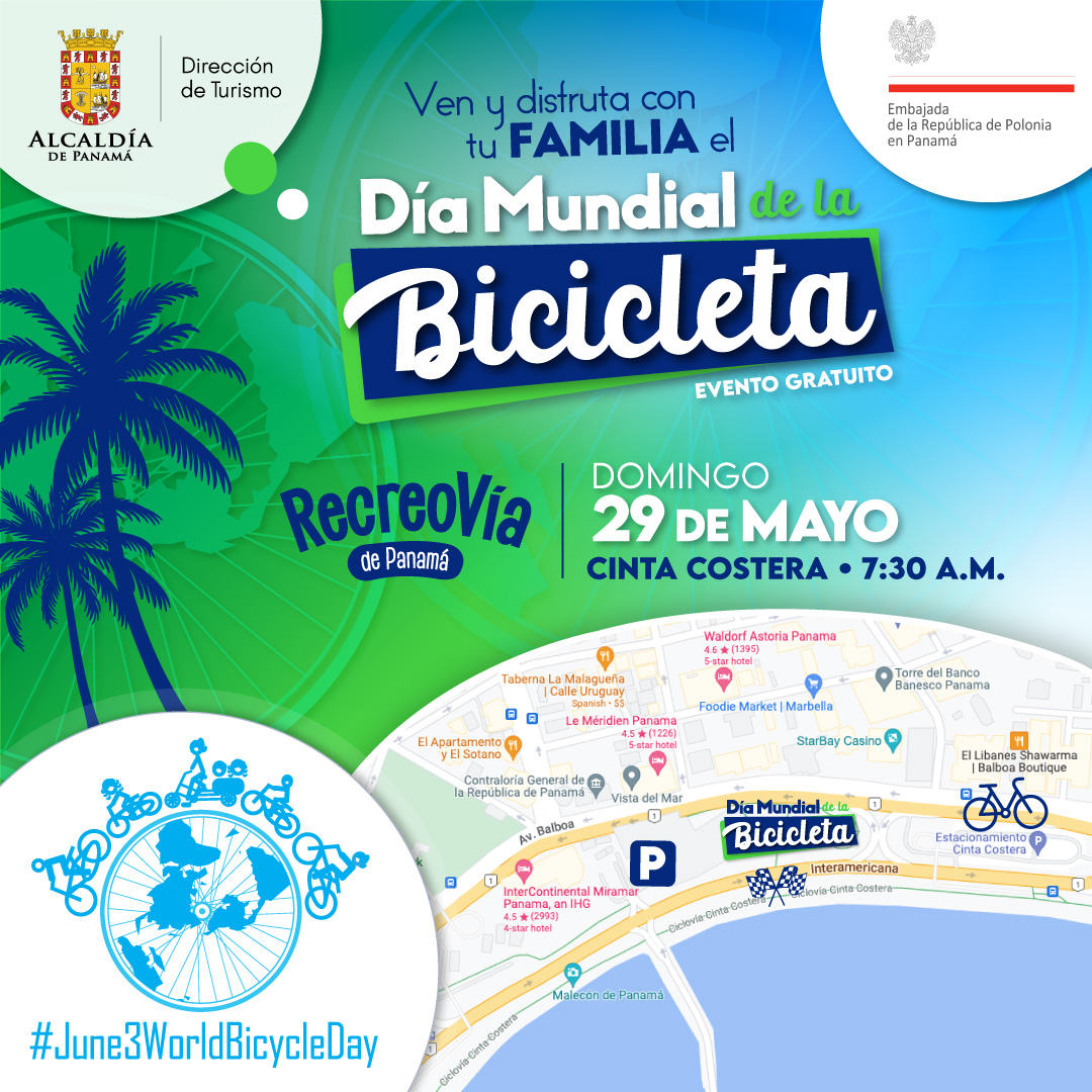Por ello, la Embajada de Polonia en Panamá en conjunto con la Alcaldía de Panamá, organizan para este 29 de Mayo de 2022 en la Ciudad de Panamá, el evento DÍA MUNDIAL DE LA BICICLETA, en su segunda edición, donde se rendirá homenaje a dicho día y se busca promover e incentivar el uso de la bicicleta como medio de transporte deportivo y alternativo, así como el impulsar el turismo con ese fin, resaltando el hecho de que Panamá cuenta con una magnífica ciclovía recreativa a lo largo de toda la Cinta Costera y el Causeway de Amador.