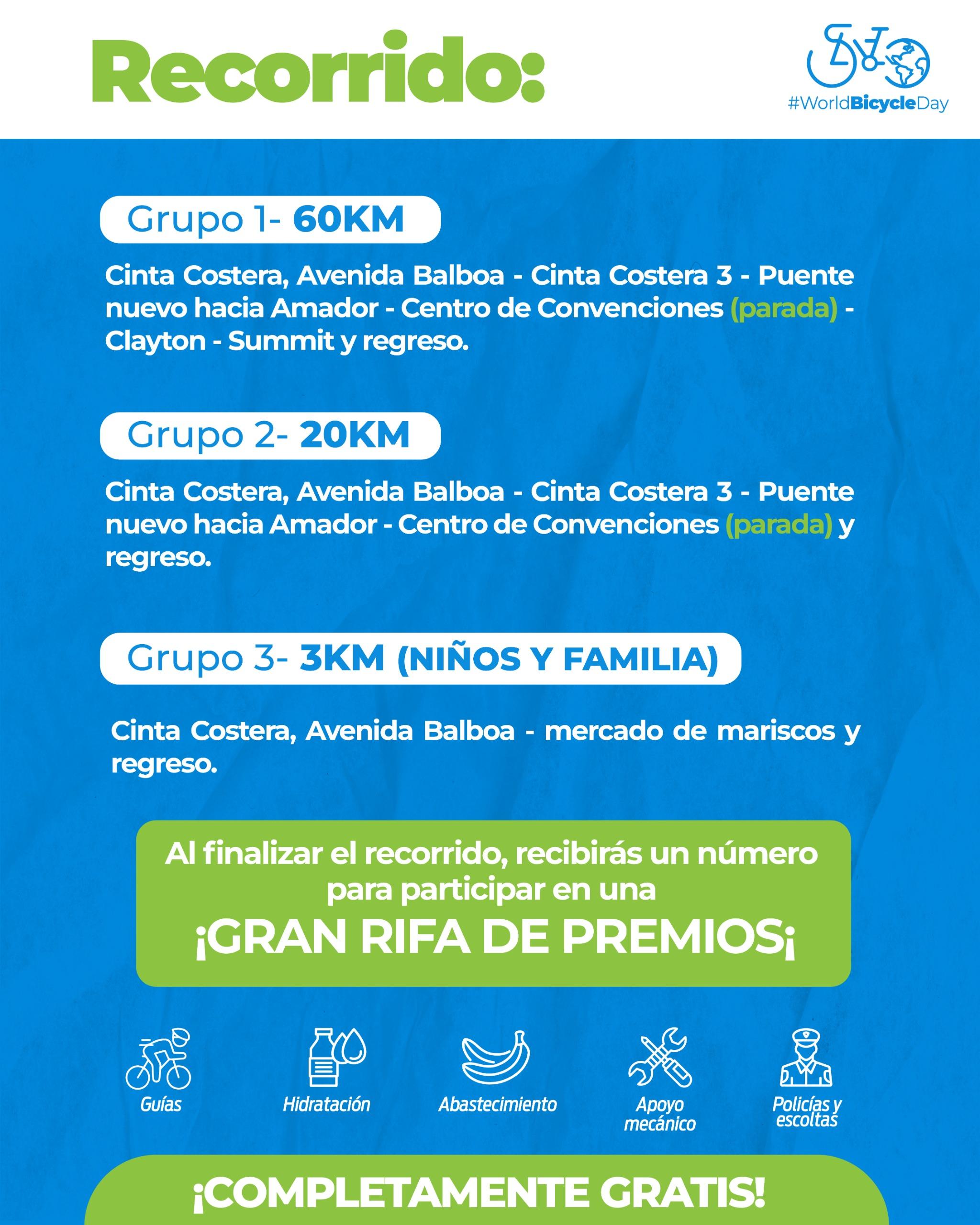 Miejsce zbiórki to parking przy Hotelu Miramar. W tym roku będziemy mieli do dyspozycji 3 trasy: Grupa 1. - 60 km, Grupa 2. - 20 km i Grupa 3. - 3 km (dzieci i rodziny). W załączeniu znajdują się grafiki z mapą miejsca zbiórki oraz szczegółami tras. Pamiętaj: kask rowerowy jest obowiązkowy. Na zakończenie każdej przejażdżki przeprowadzimy losowanie nagród, w którym będzie można wygrać rowery ufundowane przez Ambasadę RP w Panamie, Delegaturę Unii Europejskiej oraz sklep rowerowy Rali.