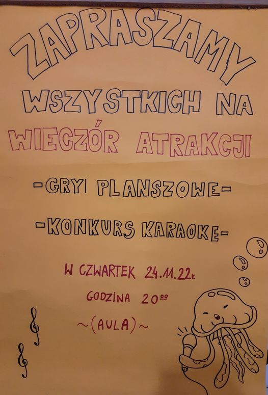 Wydarzenie odbędzie się w czwartek 24.11.2022r o godzinie 20:00 w auli.